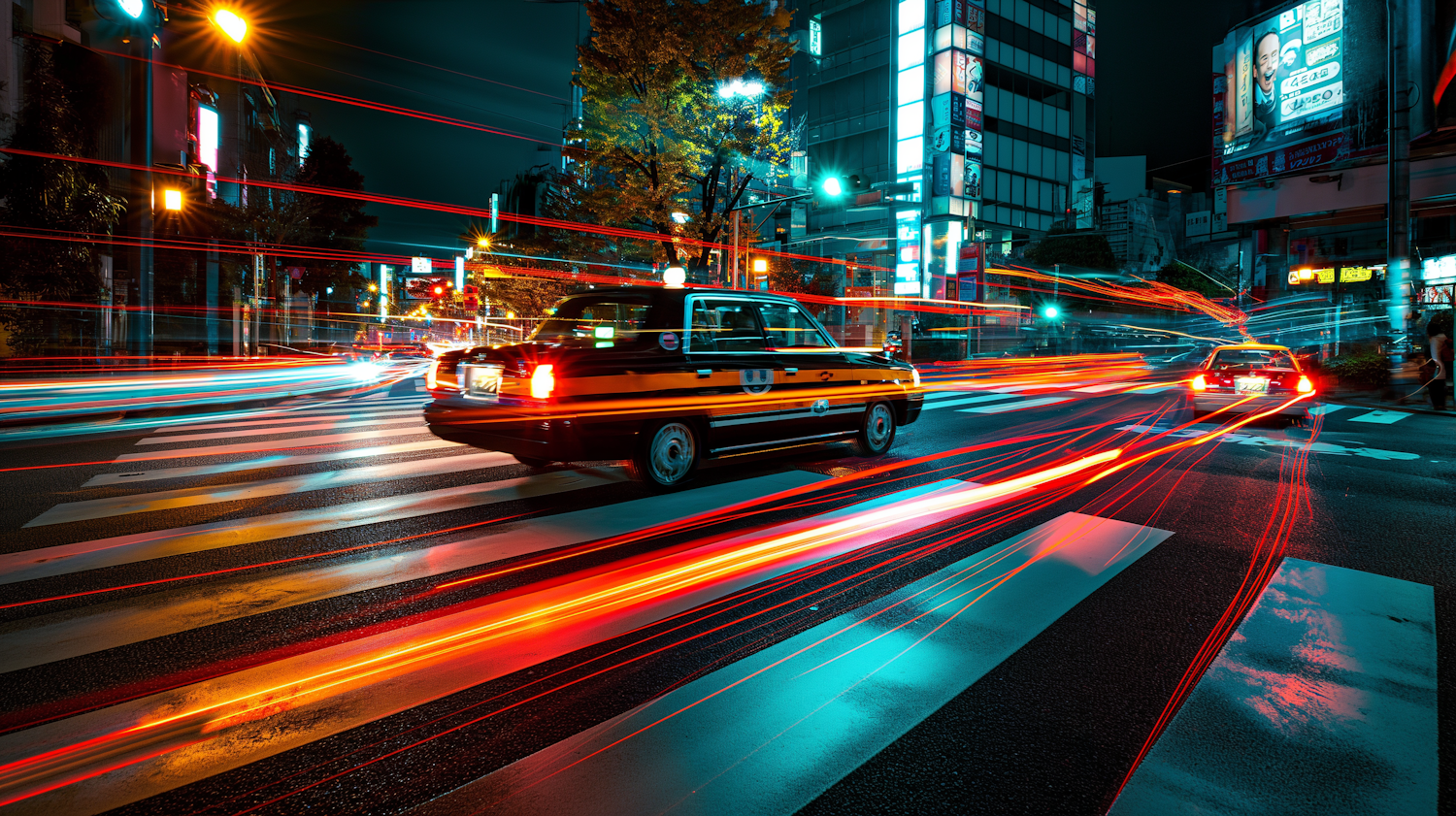 Dynamic city night scene with taxis, neon lights, and colorful light trails creating a vibrant urban atmosphere.