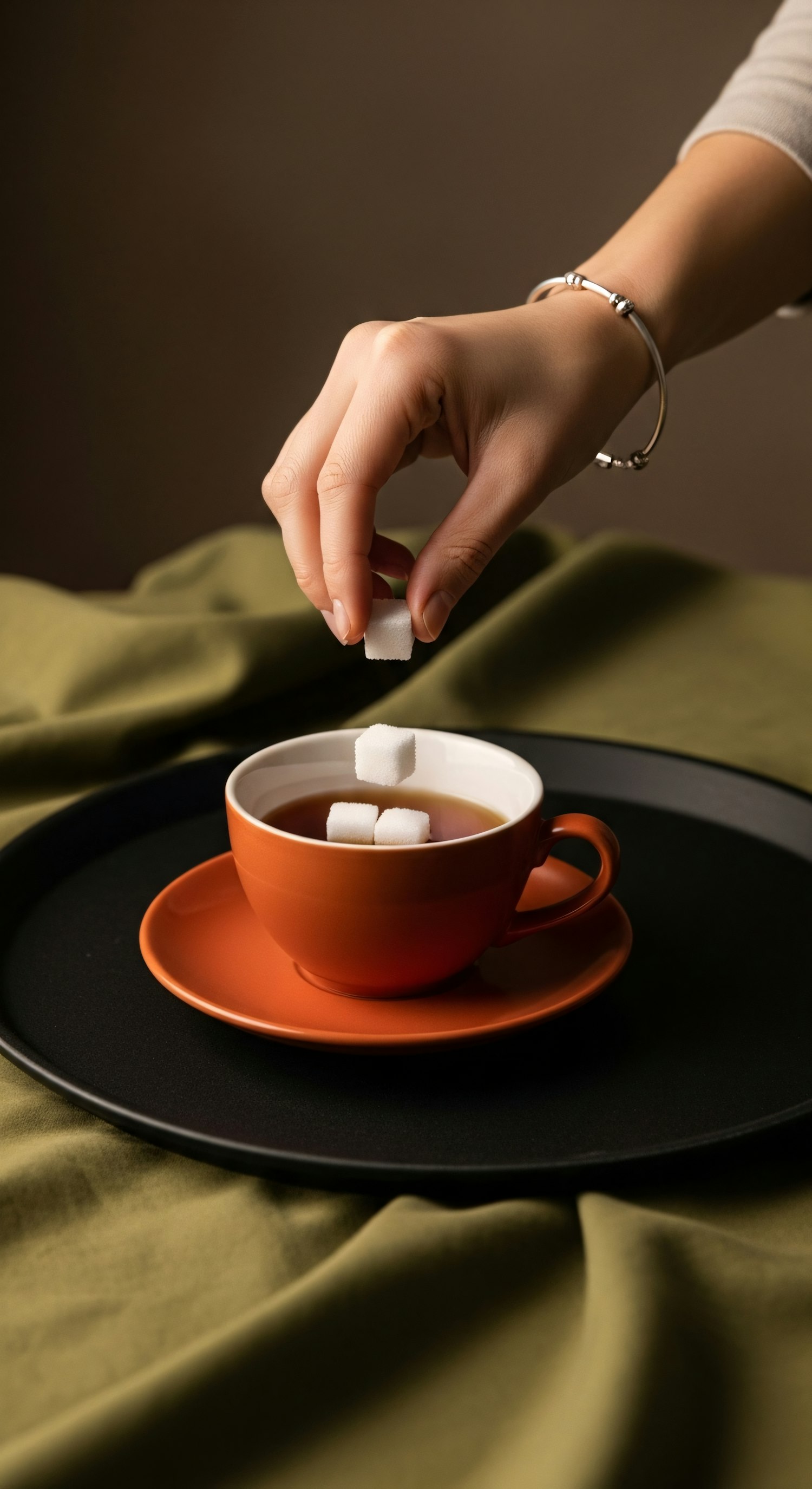 A hand drops a sugar cube into a vibrant orange tea cup on a black tray, with a cozy olive-green fabric background.