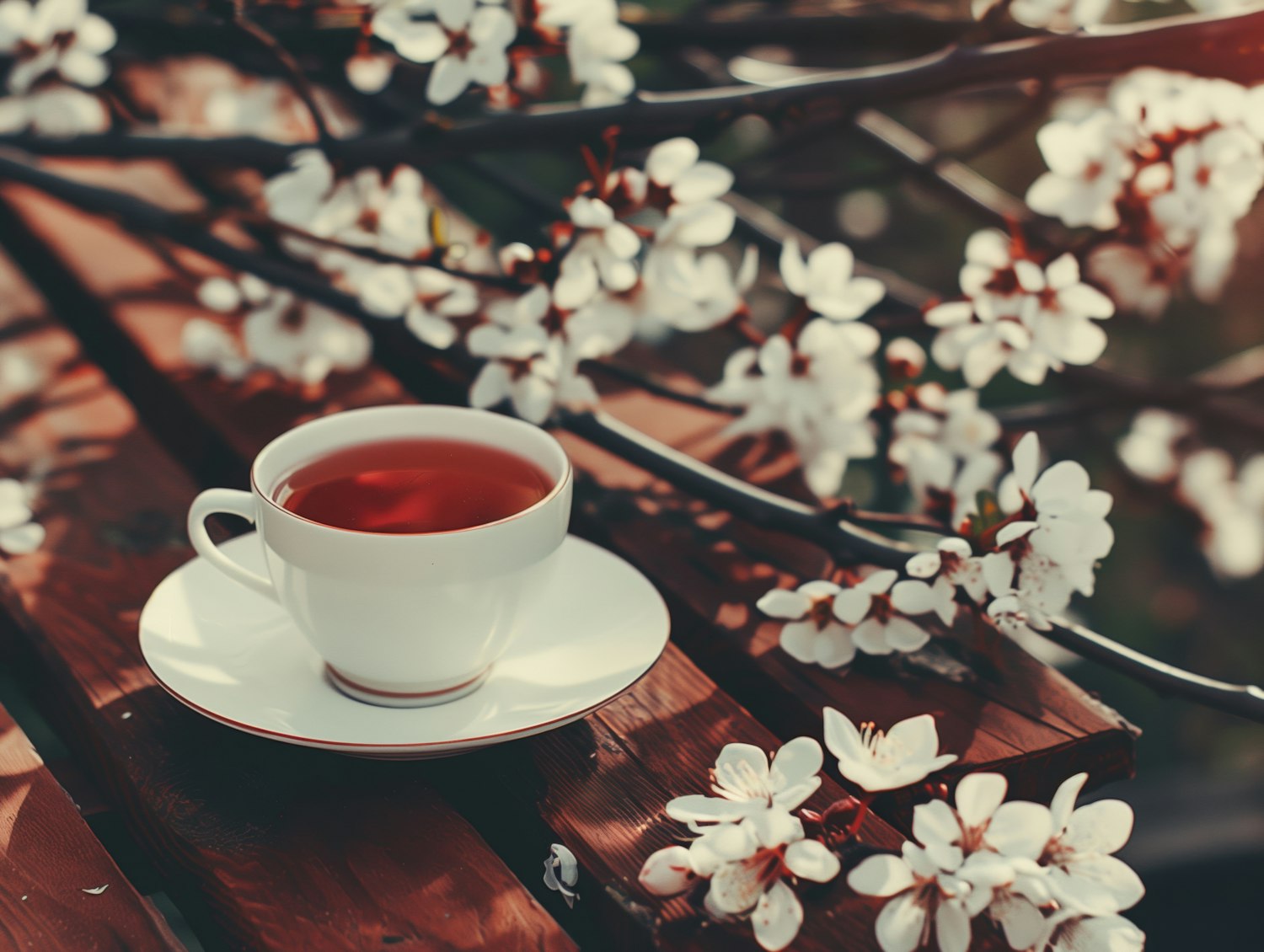 White teacup with dark tea on a wooden table, surrounded by cherry blossoms. Warm, serene atmosphere with soft lighting.