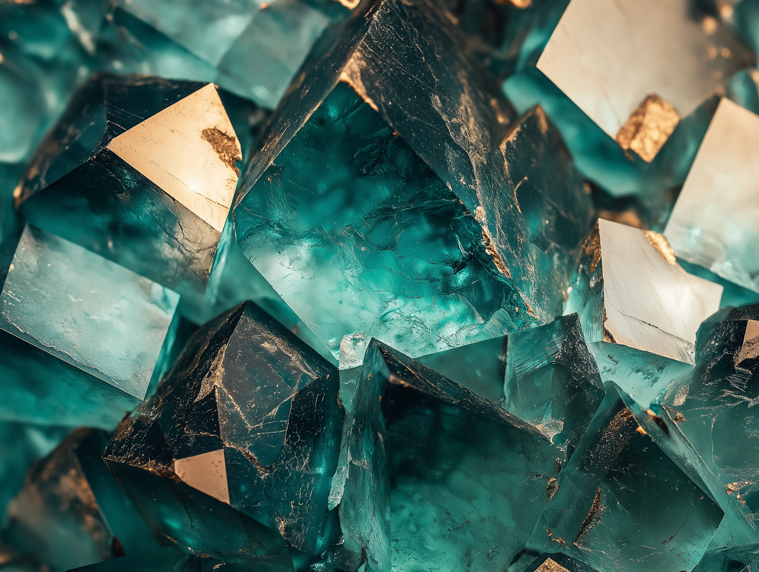 Close-up of teal crystals with golden reflections, showcasing sharp edges and a glowing, translucent quality.
