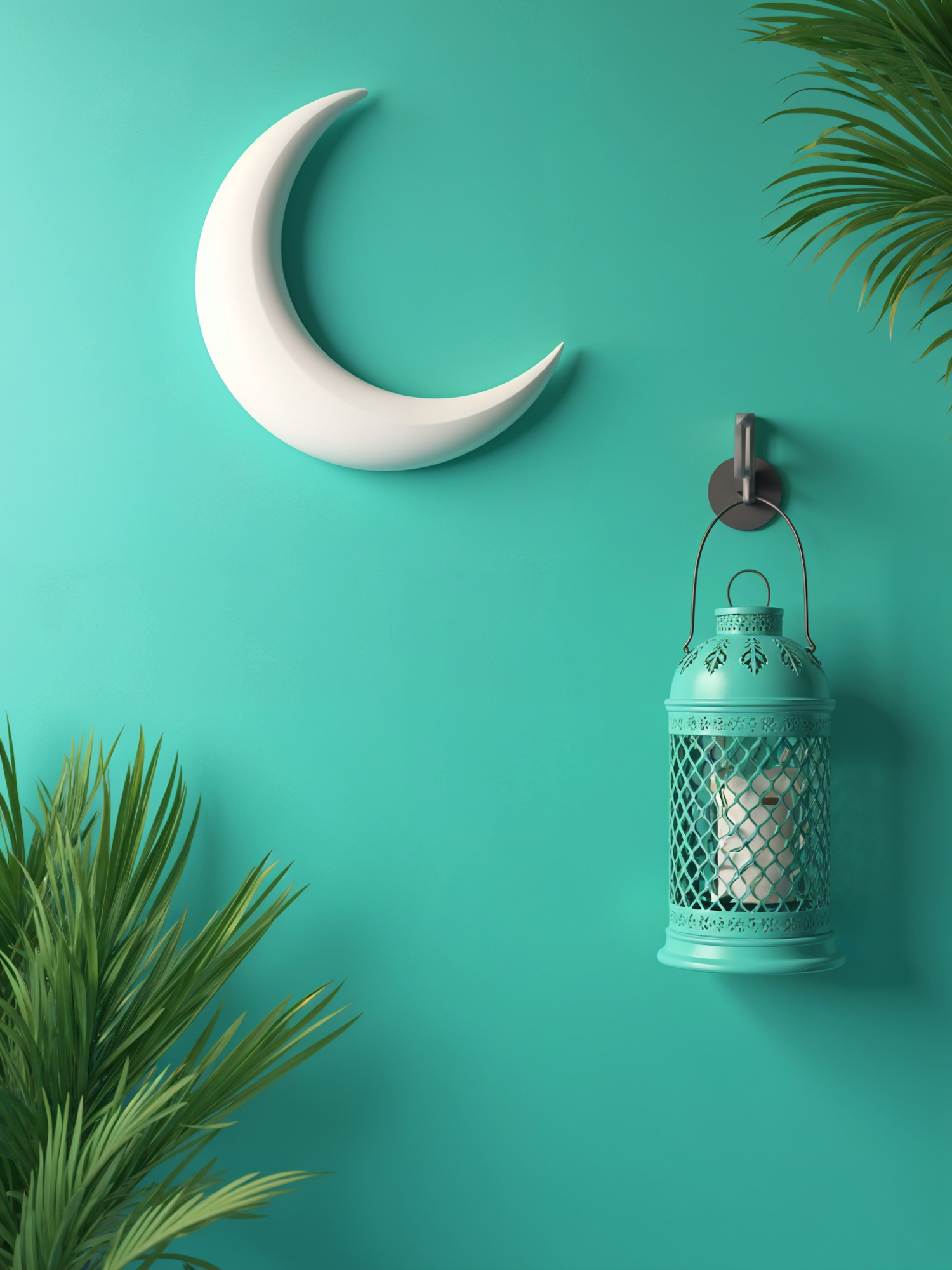 A teal wall with a crescent moon decor, a patterned teal lantern holding a candle, and lush green palm leaves for a tropical vibe.