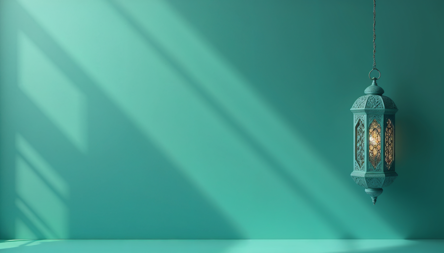 Elegant teal lantern with intricate patterns glows warmly against a teal wall, creating a serene and minimalistic ambiance.