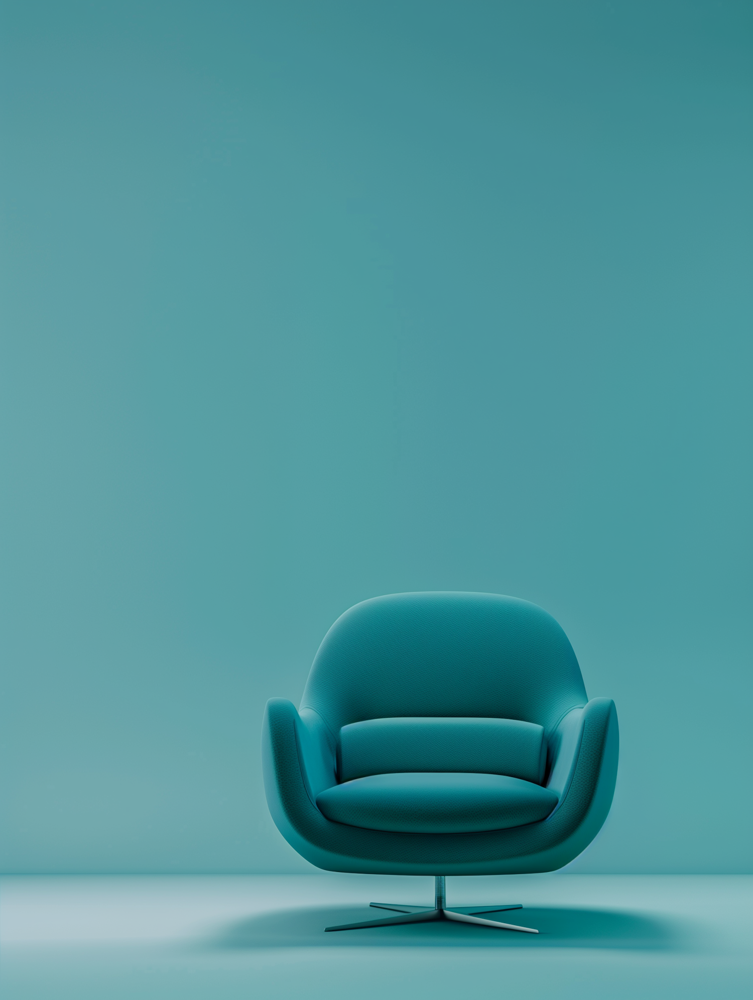 A stylish teal armchair with a rounded design and metallic swivel base, set against a matching teal background for a modern look.