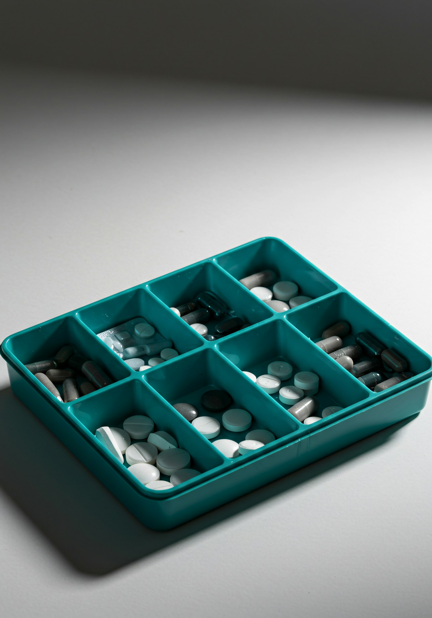 Teal organizer with compartments holding white, gray, and black pills on a light gray surface, creating a clean and minimalistic look.