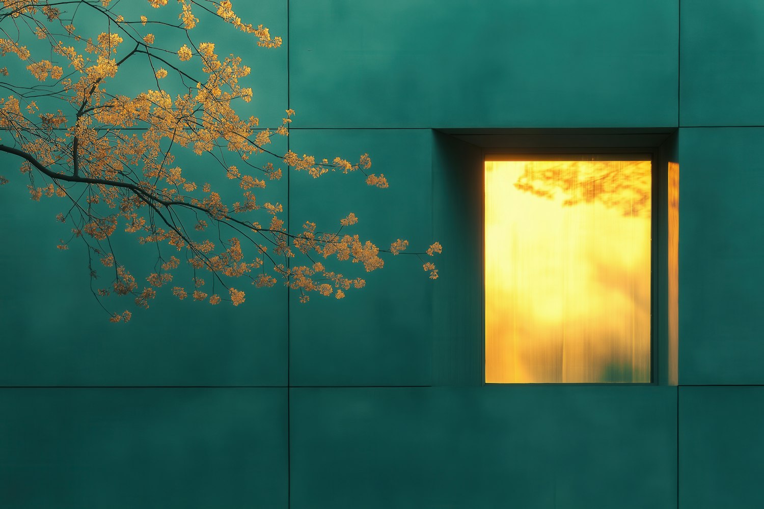 Teal wall with a glowing golden window and delicate tree branches with golden leaves, creating a serene and minimalist aesthetic.