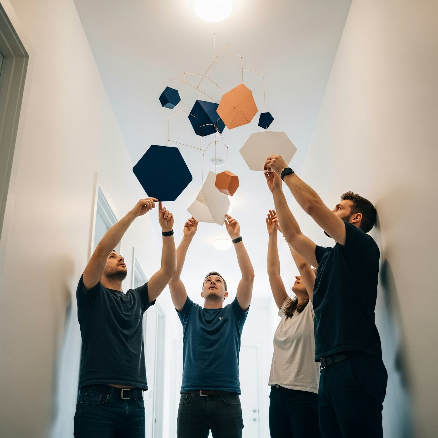 A group of people collaborates on adjusting a geometric mobile in a bright hallway, showcasing teamwork and creativity.