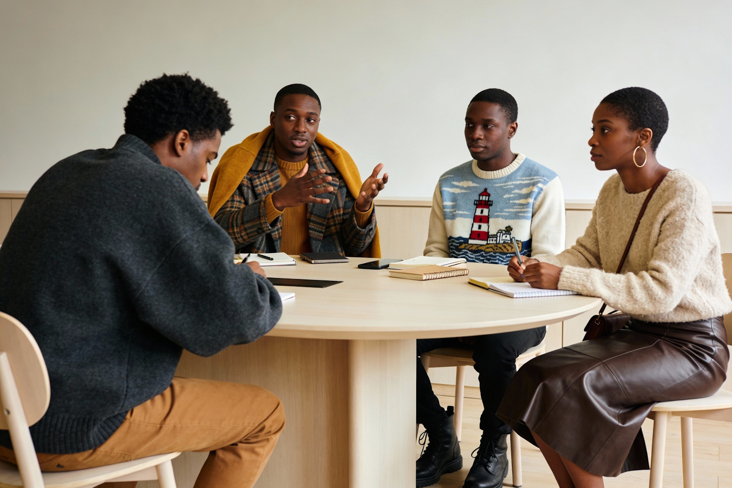 Four Black individuals sit around a Scandinavian conference table, engaged in discussion. One leans forward in a dark gray oversized sweater and tan trousers, another gestures while wearing a plaid coat with a mustard yellow sweater draped over the shoulders. The lighthouse sweater adds a pop of visual storytelling. A woman in a leather midi skirt and fuzzy beige sweater takes notes. Accessories like hoop earrings, crossbody bags, and notebooks add texture and personality. The composition captures collaboration, quiet intensity, and layered fashion in motion