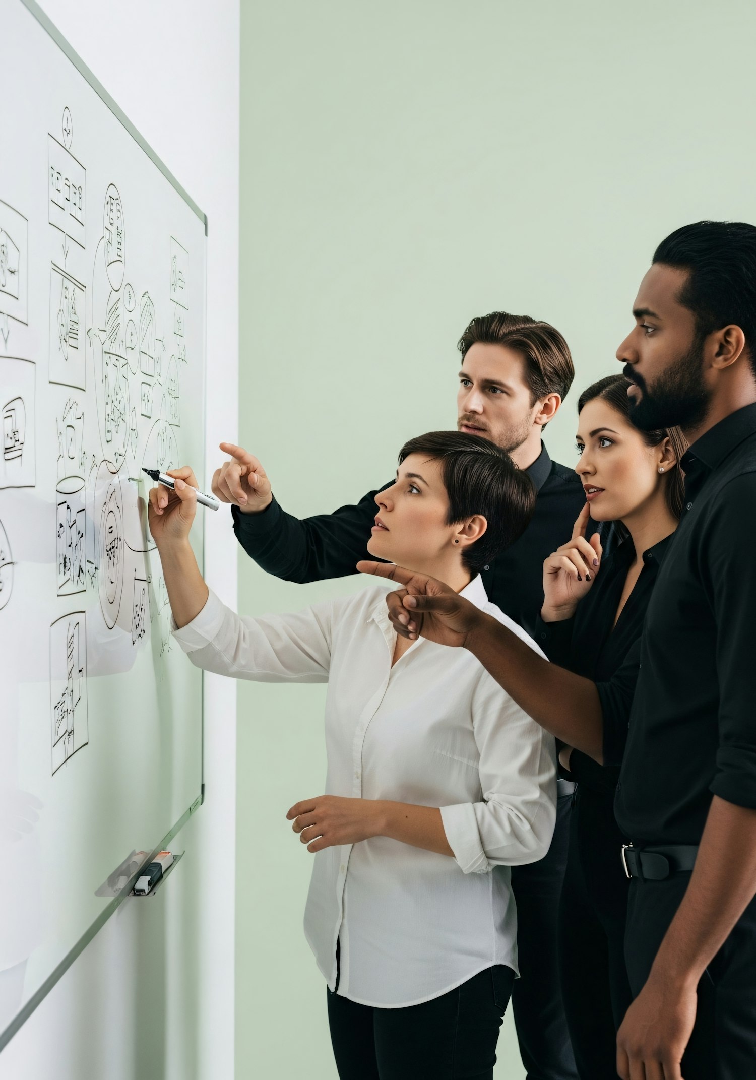 A team collaborates at a whiteboard, discussing ideas and planning, showcasing teamwork and creativity in a professional setting.