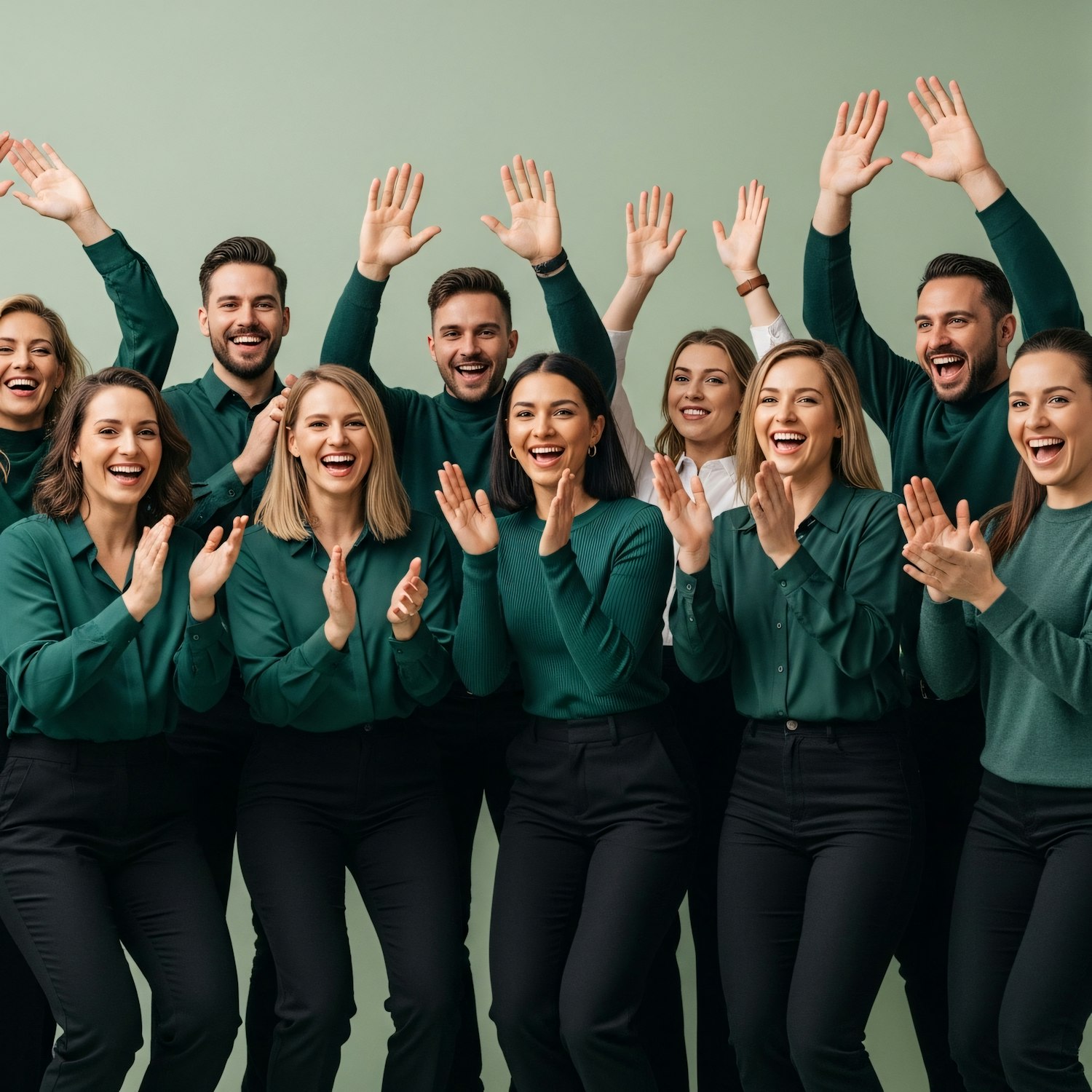 A cheerful group of people in green tops and black pants celebrating together against a light green background.