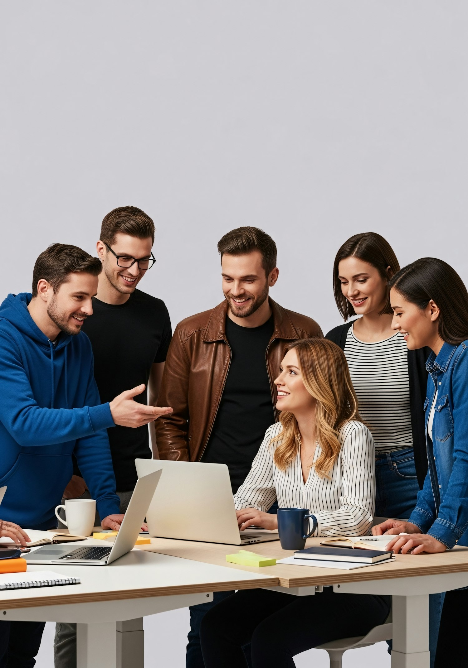 A group of young professionals collaborating around a table with laptops and notebooks, fostering a creative and productive atmosphere.