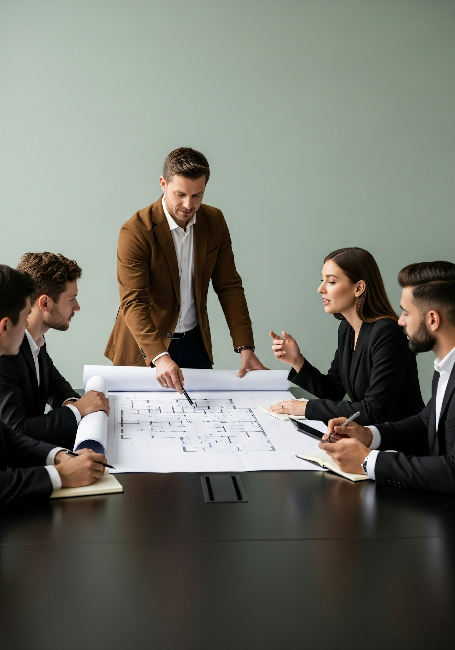 A team of professionals collaborates over a blueprint in a modern office, showcasing teamwork and planning in a business setting.