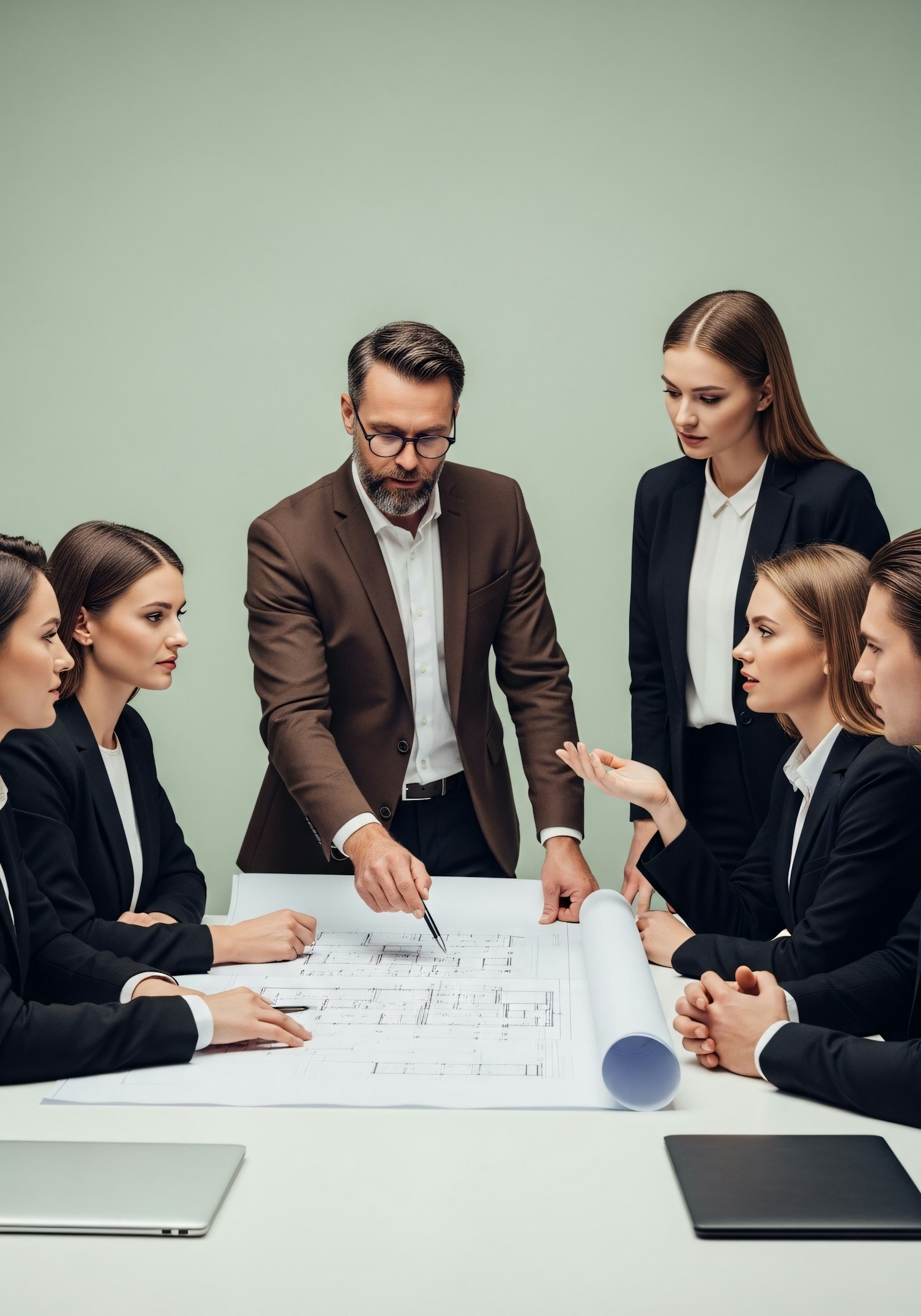 A team of professionals collaborates over a blueprint, showcasing teamwork and focus in a modern office setting.