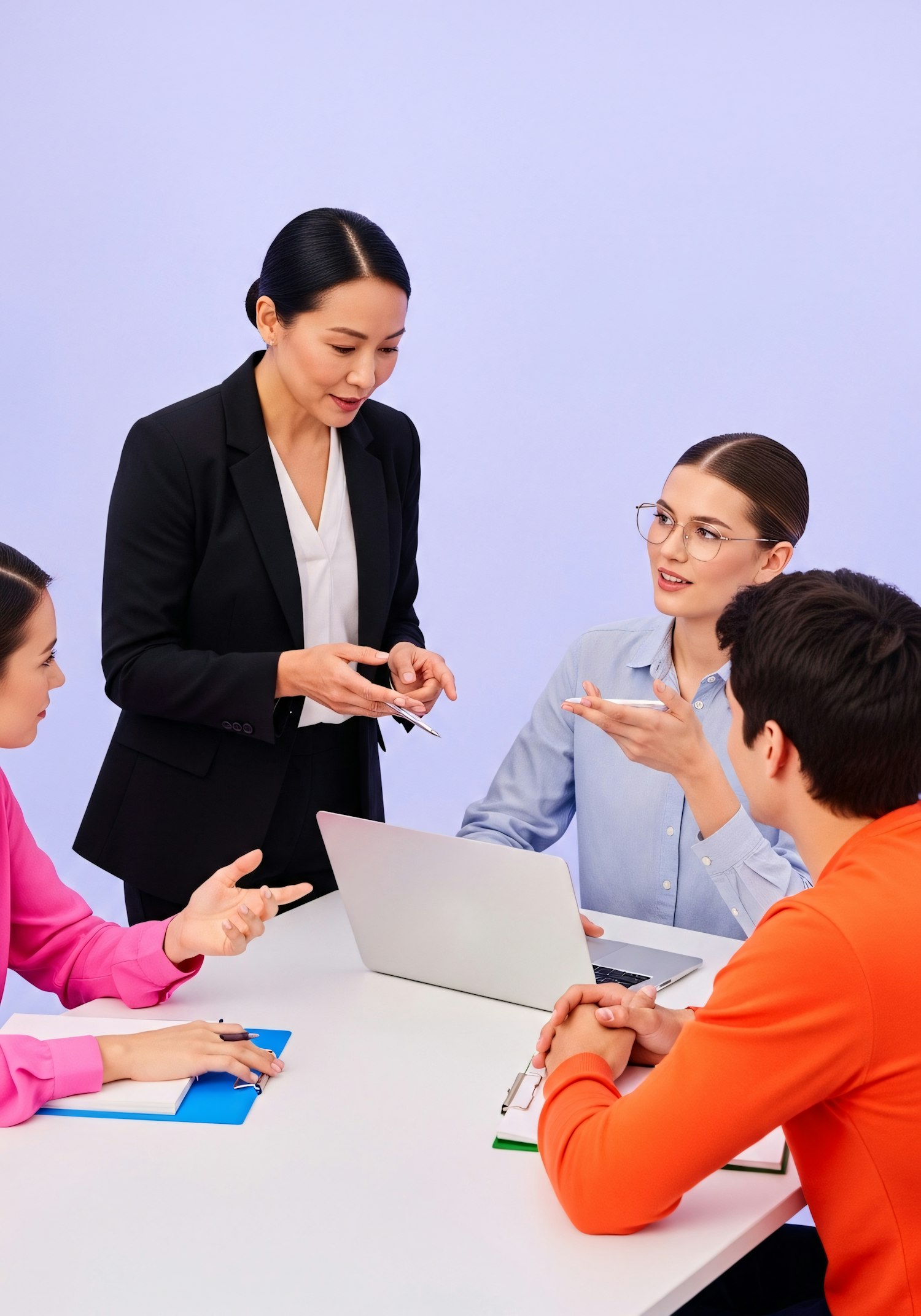 A professional team collaborates around a table, discussing ideas with a laptop in a bright, modern setting.