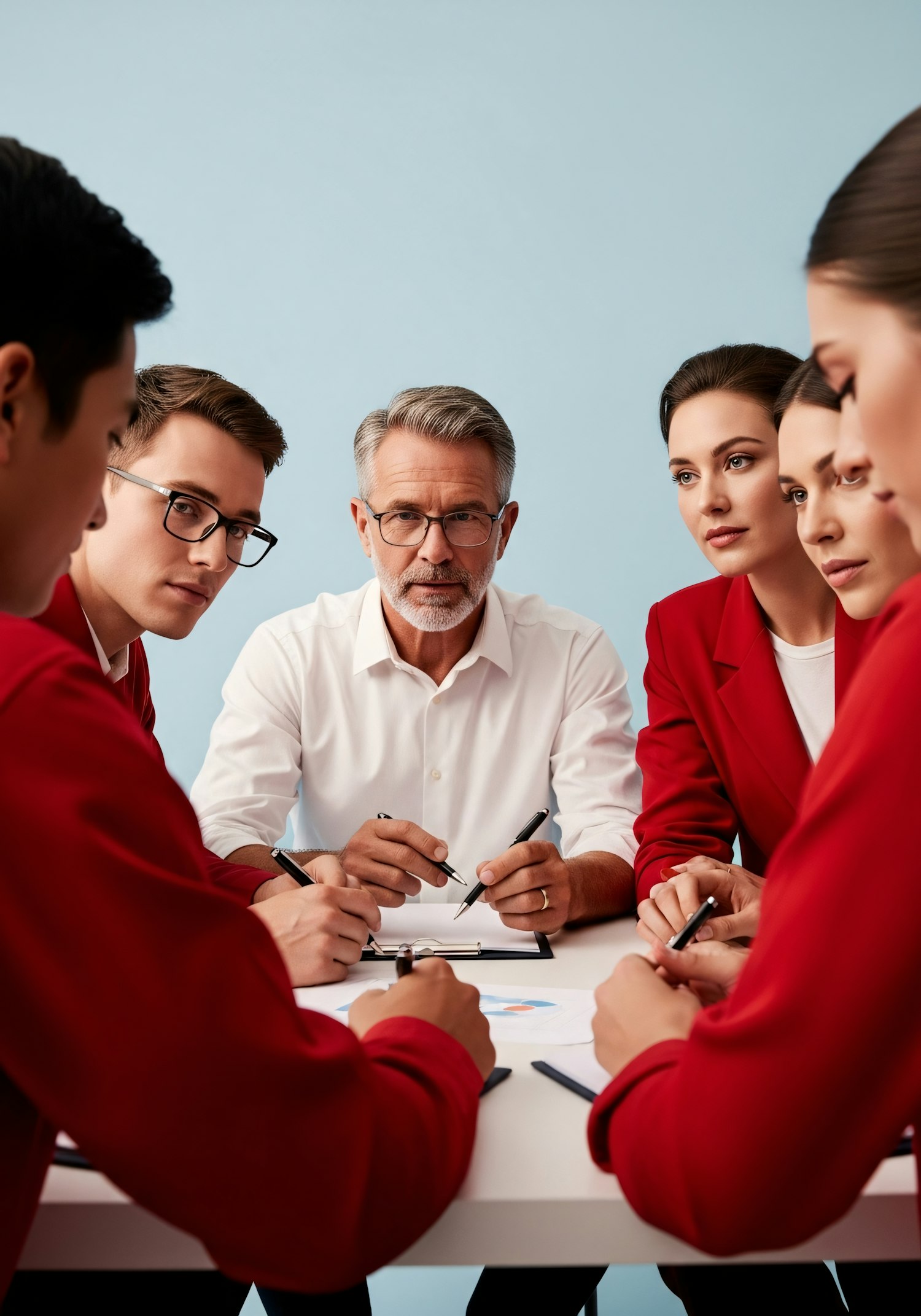 A team collaborates around a table, with a leader guiding the discussion, creating a professional and focused atmosphere.