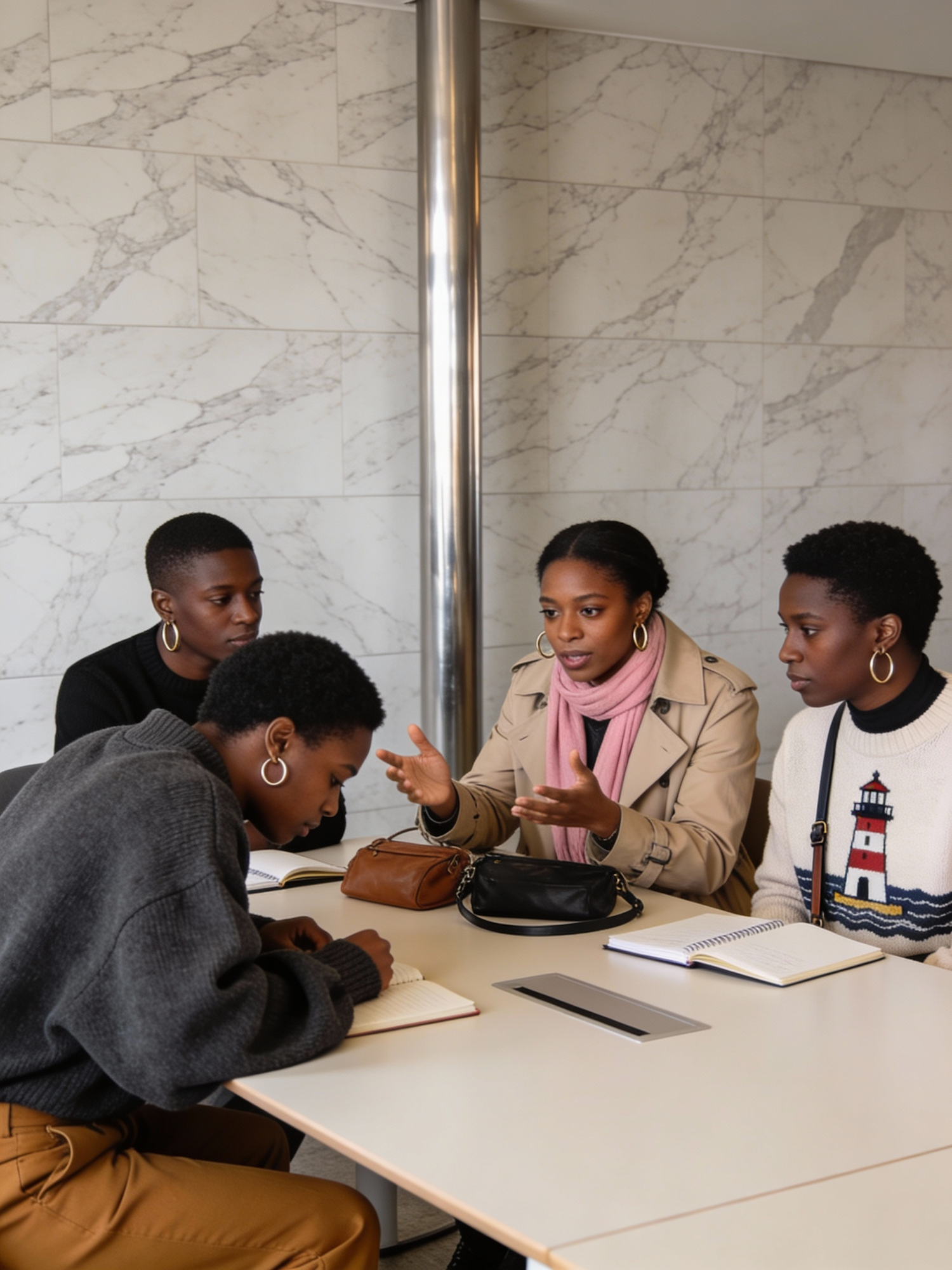 Four Black individuals sit around a Scandinavian conference table, engaged in discussion. One leans forward in a dark gray oversized sweater and tan trousers, another gestures while wearing a beige trench coat and pink scarf. The lighthouse sweater adds a pop of visual storytelling. The room is softly lit, with shadows cast across the marble-patterned wall and metal pole. Accessories like hoop earrings, crossbody bags, and notebooks add texture and personality. The composition captures collaboration, quiet intensity, and layered fashion in motion.