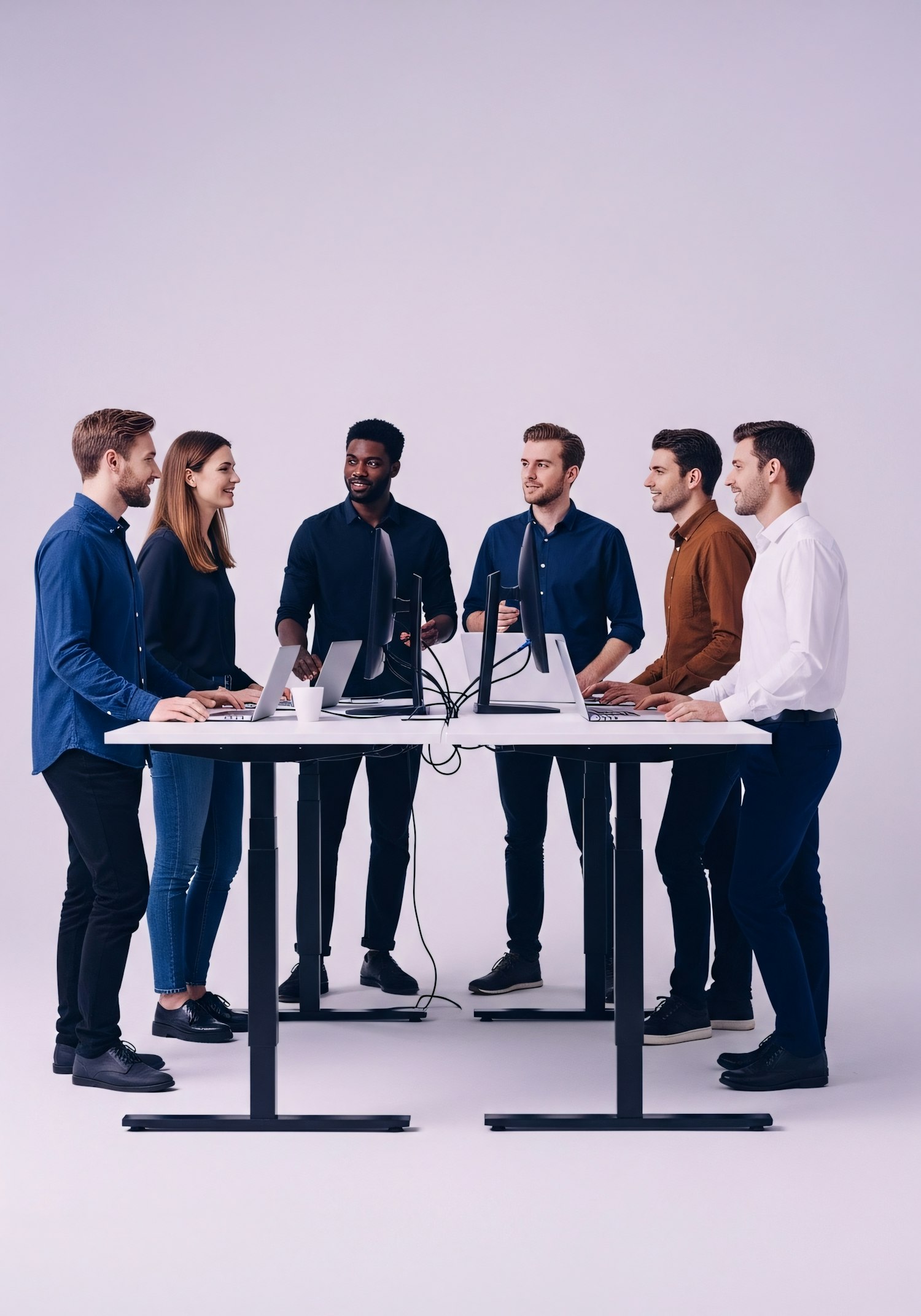 A team collaborates around standing desks with laptops and monitors, fostering a professional and engaging workspace.