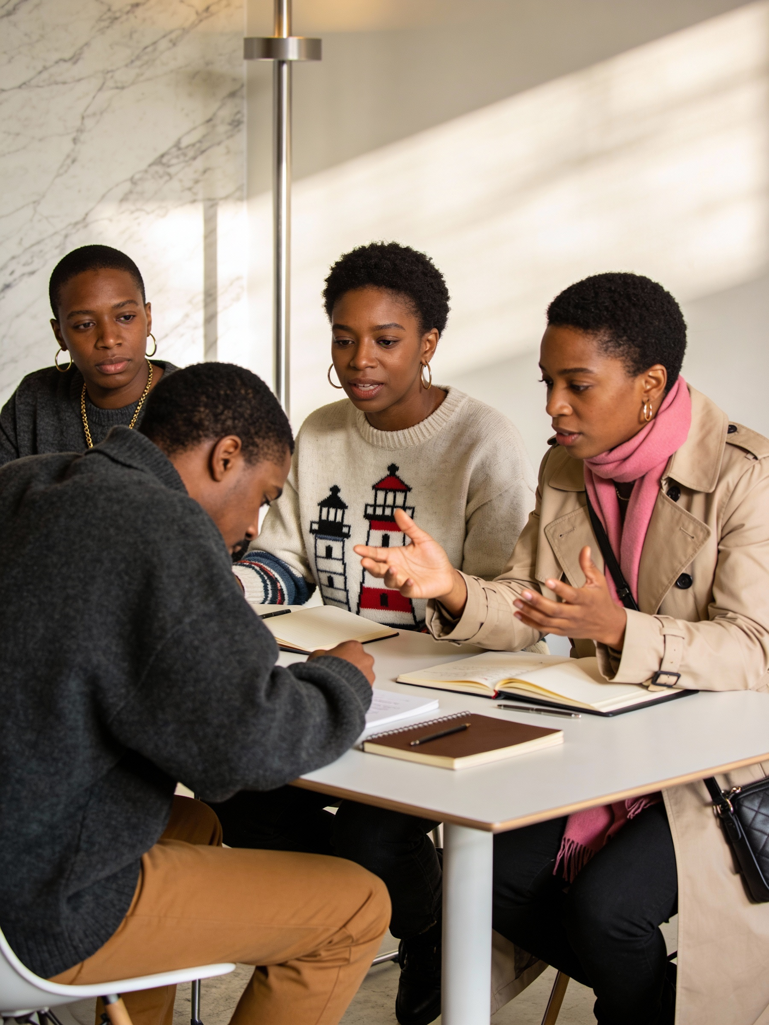 Four Black individuals sit around a Scandinavian conference table, engaged in discussion. One leans forward in a dark gray oversized sweater and tan trousers, another gestures while wearing a beige trench coat and pink scarf. The lighthouse sweater adds a pop of visual storytelling. The room is softly lit, with shadows cast across the marble-patterned wall and metal pole. Accessories like hoop earrings, crossbody bags, and notebooks add texture and personality. The composition captures collaboration, quiet intensity, and layered fashion in motion.