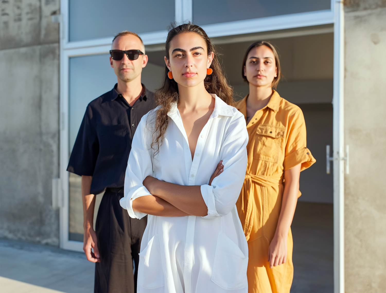 Three stylish individuals pose confidently in front of a modern building, showcasing contemporary fashion in bright sunlight.