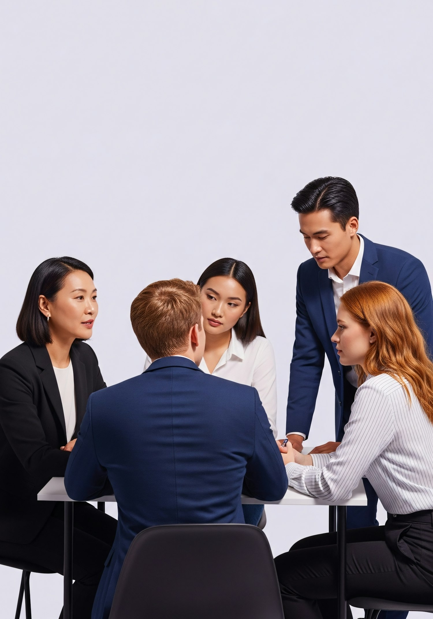 A professional group of five people in a collaborative discussion, dressed in business attire, with a plain light background.