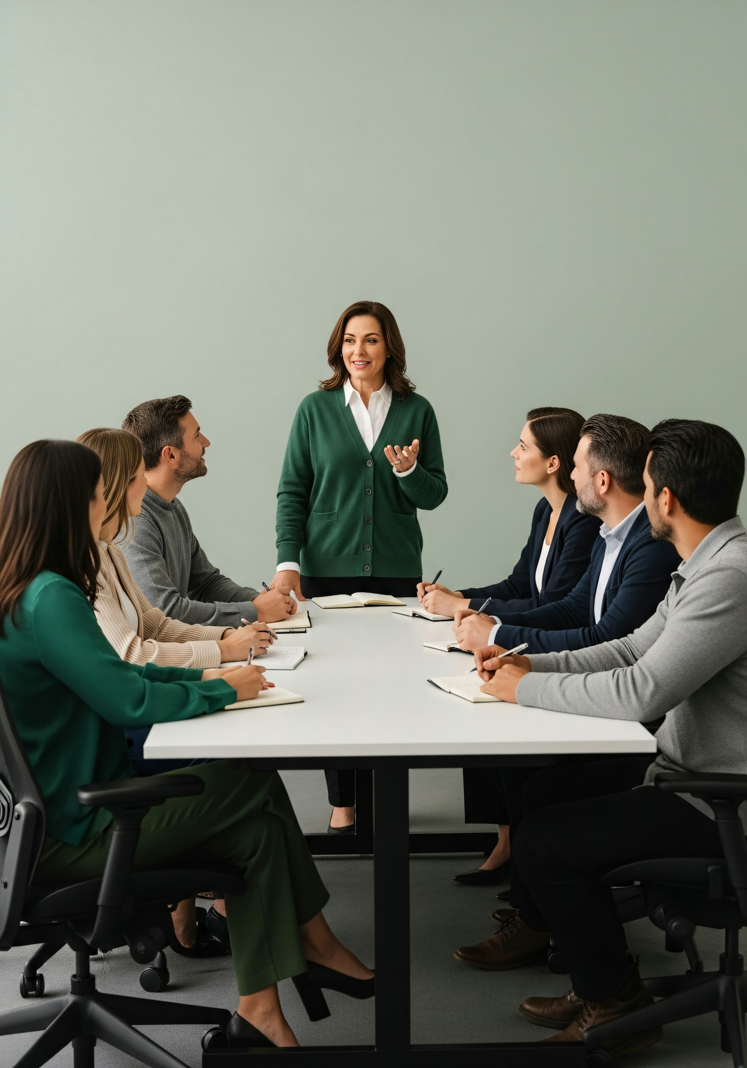 A professional team in a meeting, with a woman leading the discussion while others attentively take notes in a modern office setting.