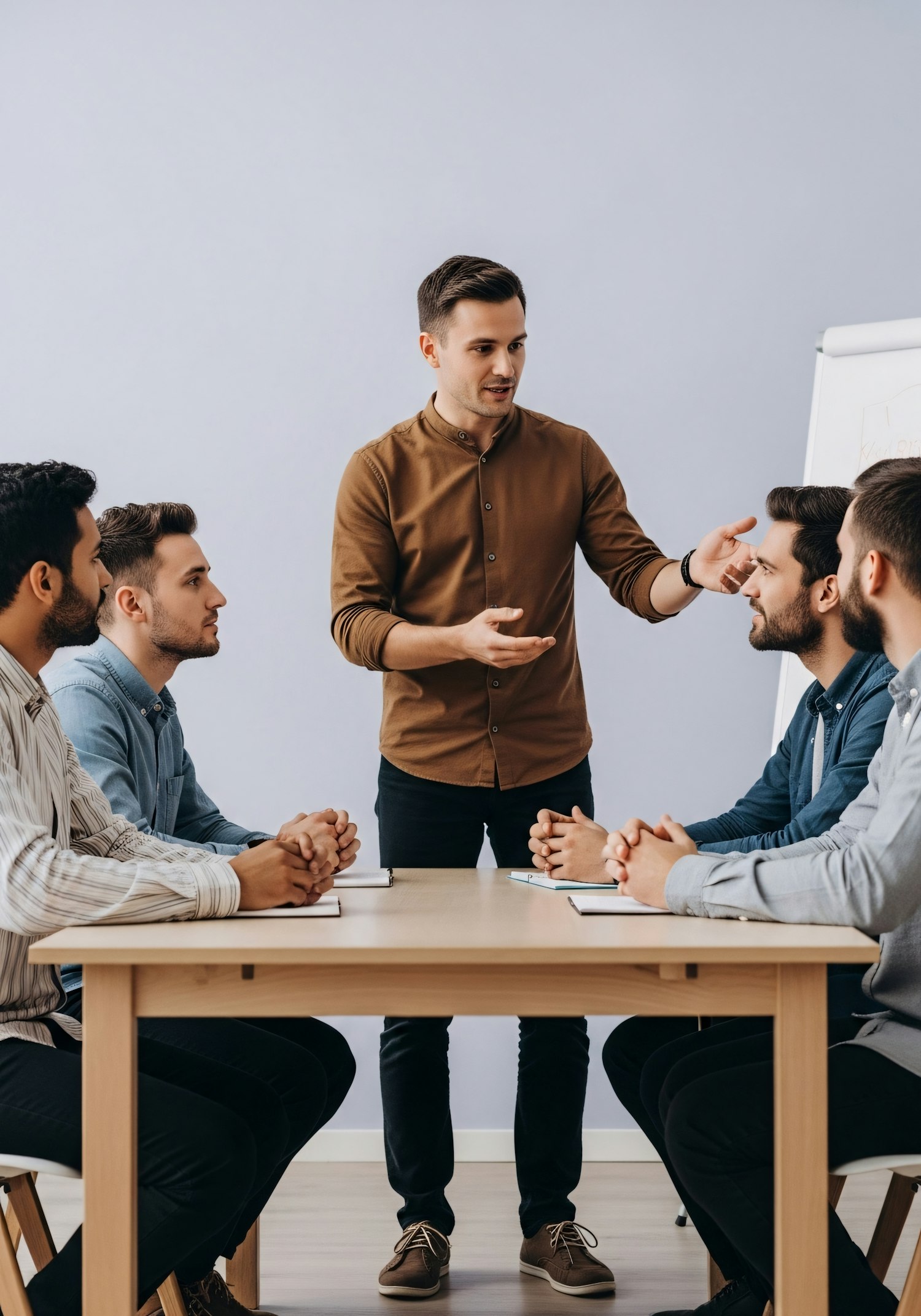 A group of professionals in a meeting, with one standing and leading the discussion while others listen attentively around a table.