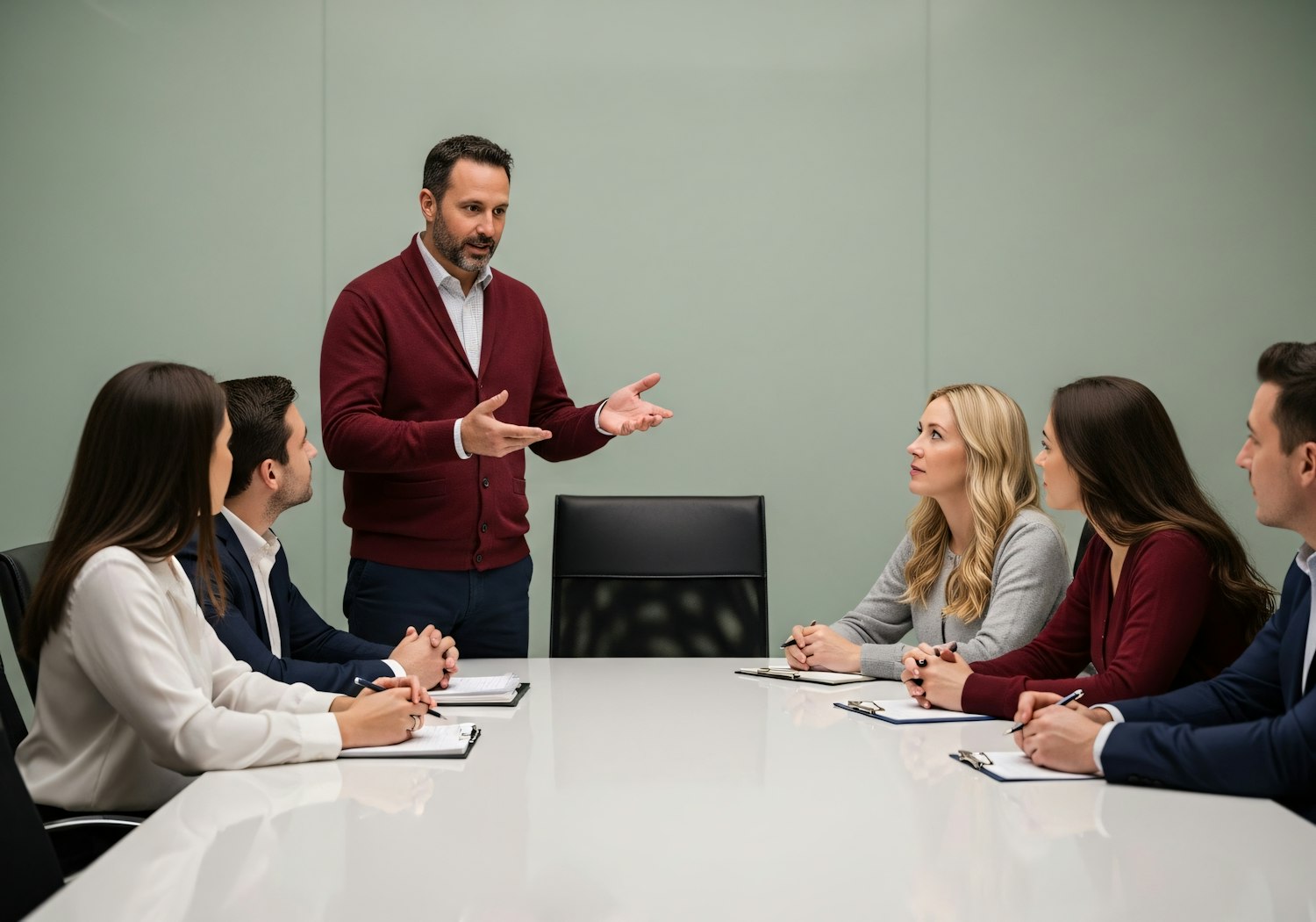 A professional meeting with a man presenting to four attentive colleagues in a modern conference room.