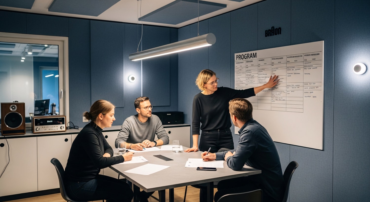 Team collaborating in a modern conference room with a whiteboard and audio equipment, discussing a program schedule.
