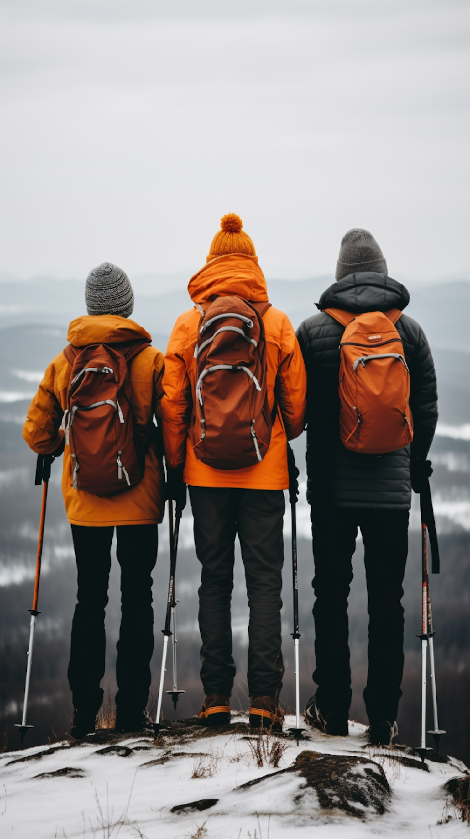 Three hikers in winter gear stand on a snowy peak, overlooking misty mountains. They wear orange jackets and carry backpacks.