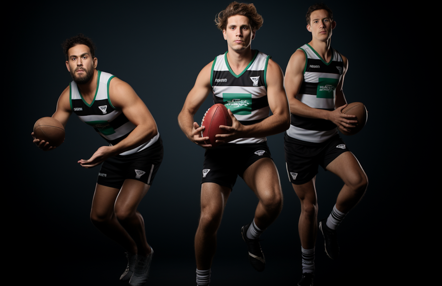 Three athletes in striped sports uniforms pose with footballs, showcasing strength and focus against a dark background.