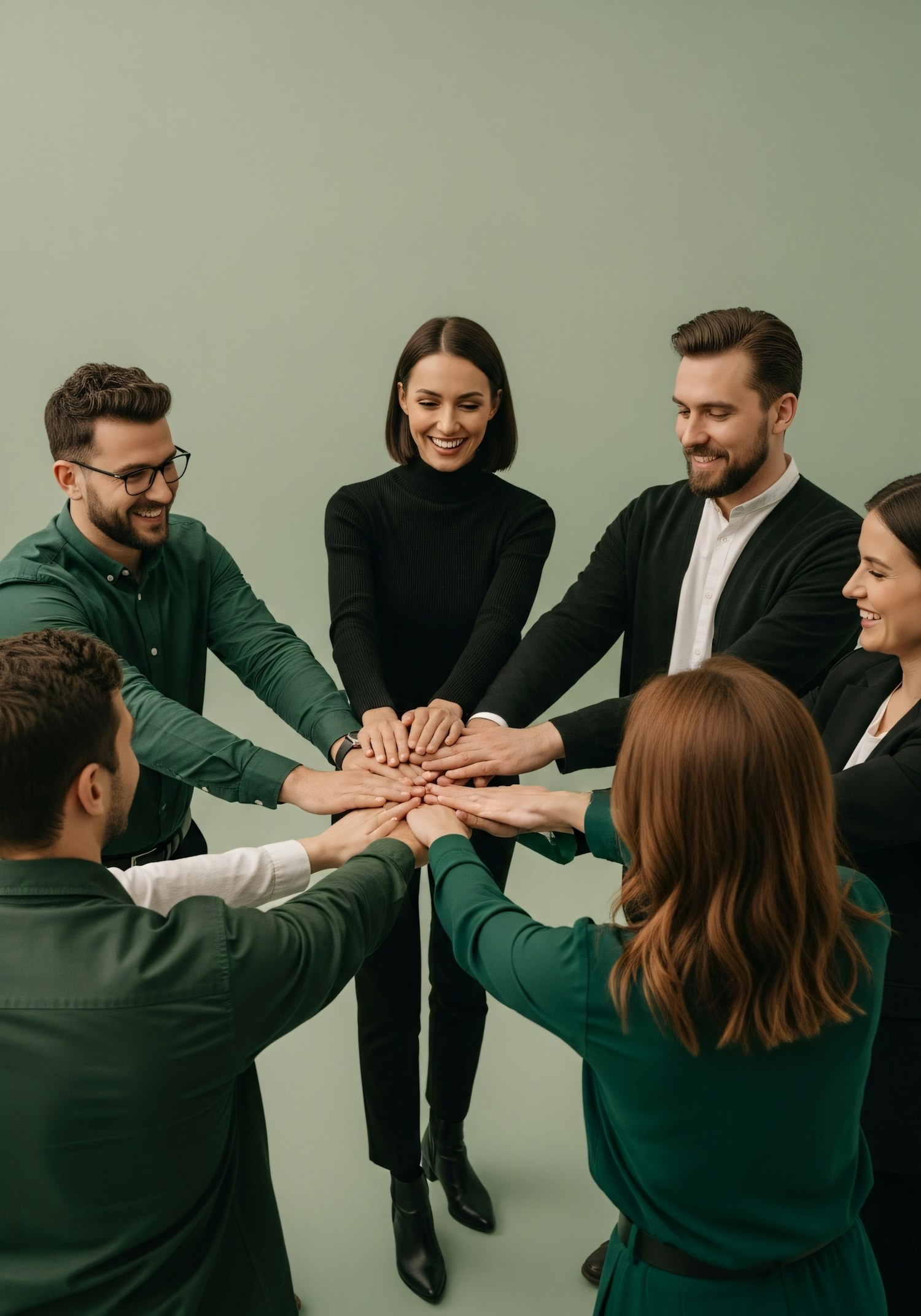 A group of people in green and black outfits join hands in a circle, symbolizing teamwork and unity against a light green background.