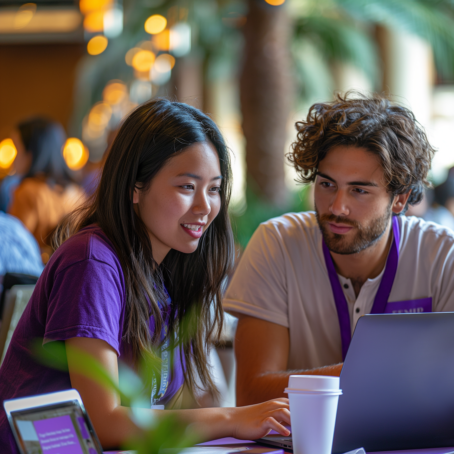Two young adults collaborating at a table with a laptop, coffee, and tablet, in a warm, inviting setting with blurred background.