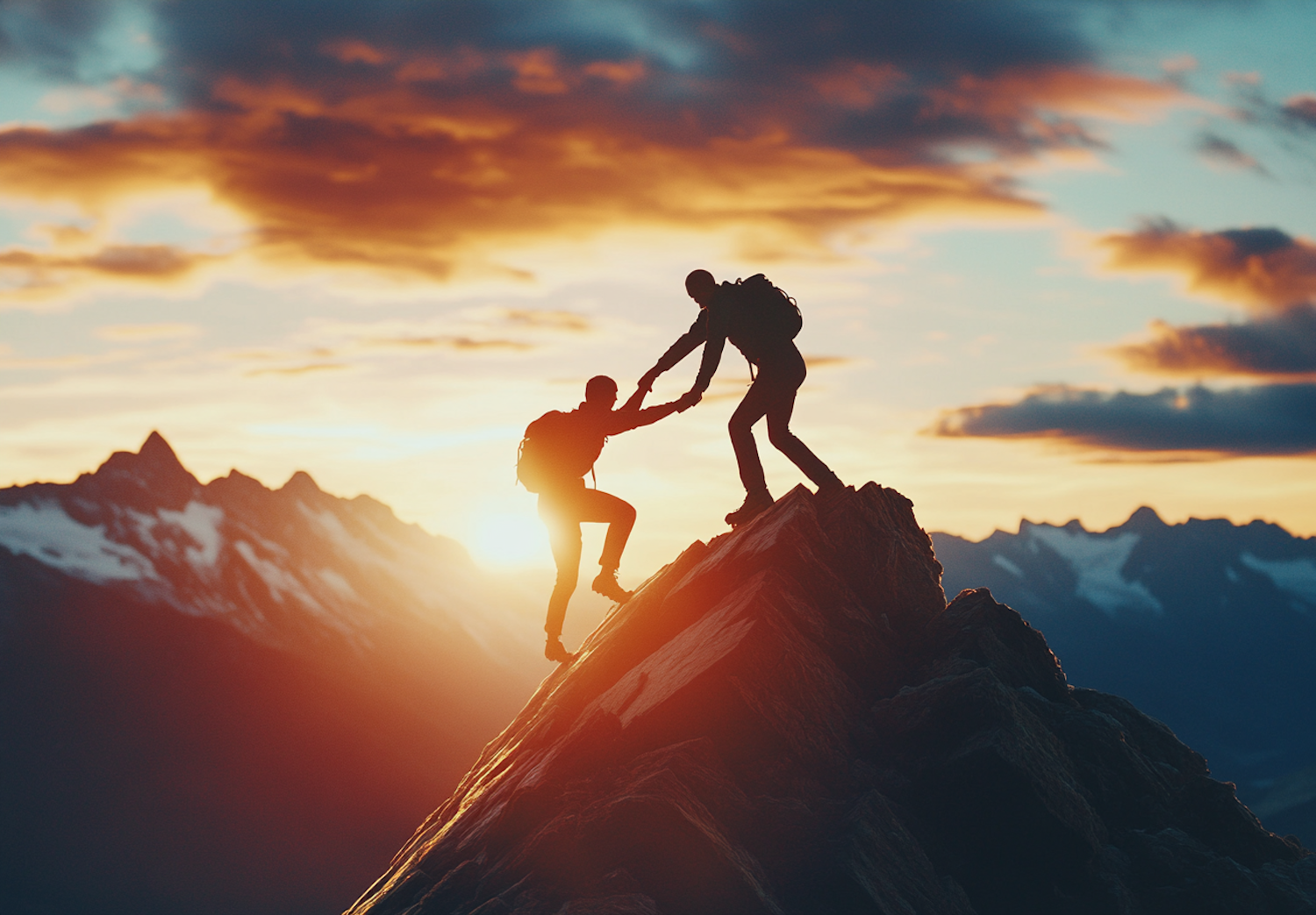 Silhouetted hikers help each other on a mountain peak at sunset, with a stunning backdrop of snow-capped mountains.