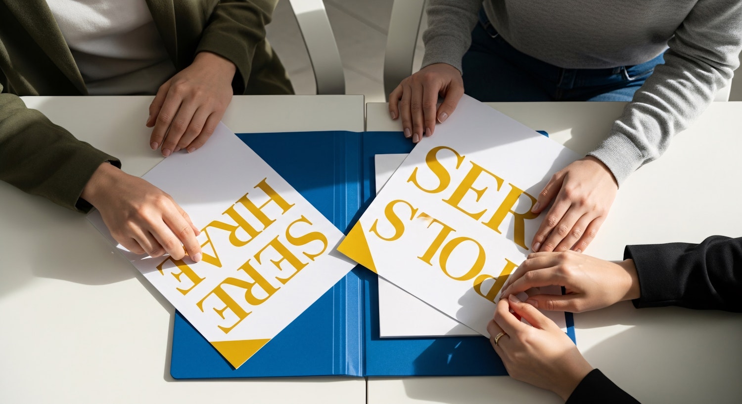 Three people collaborate over documents with bold yellow text, placed on a blue folder, in a bright and professional setting.