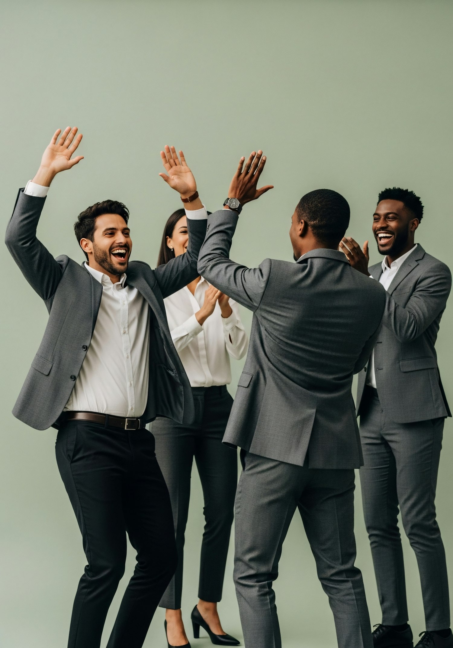 A group of professionals in suits celebrating with high-fives and smiles, showcasing teamwork and success in a light green setting.