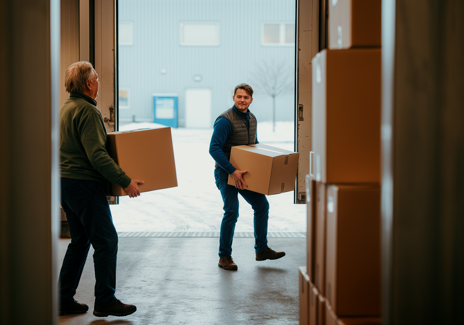 Two people carrying boxes in a warehouse with a snowy outdoor background, showcasing teamwork and productivity.