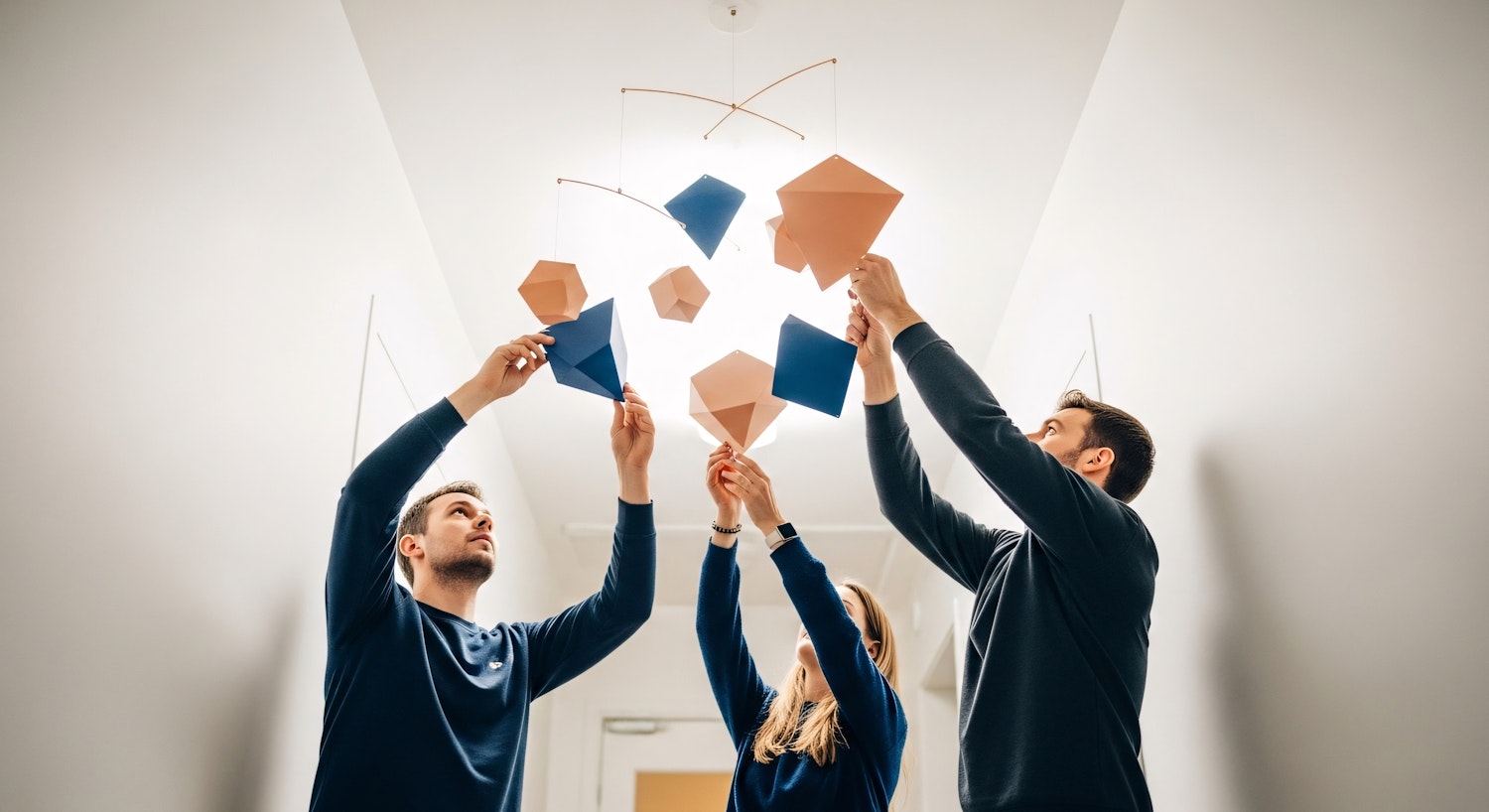 Three people collaborate on adjusting a geometric mobile with blue and beige shapes in a modern, minimalistic interior space.