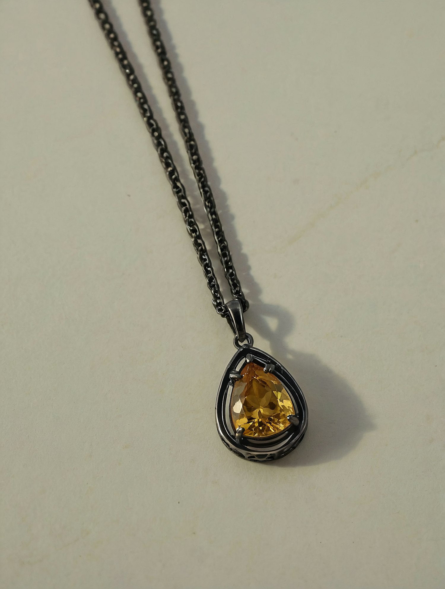 Elegant necklace with a dark chain and a teardrop-shaped yellow gemstone pendant, set in a dark metal frame.