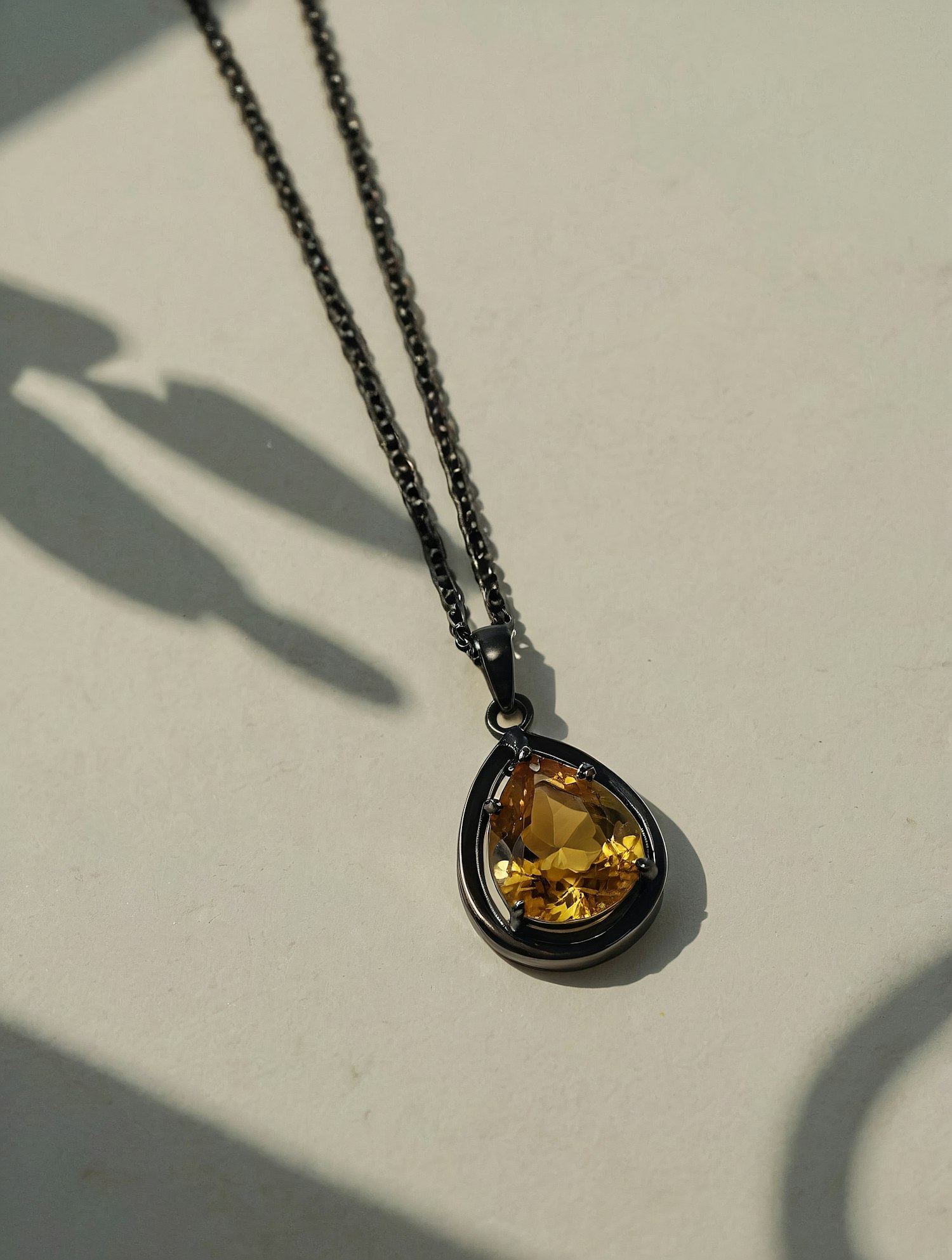 Elegant necklace with a dark chain and a teardrop-shaped yellow gemstone pendant, set against a light background.