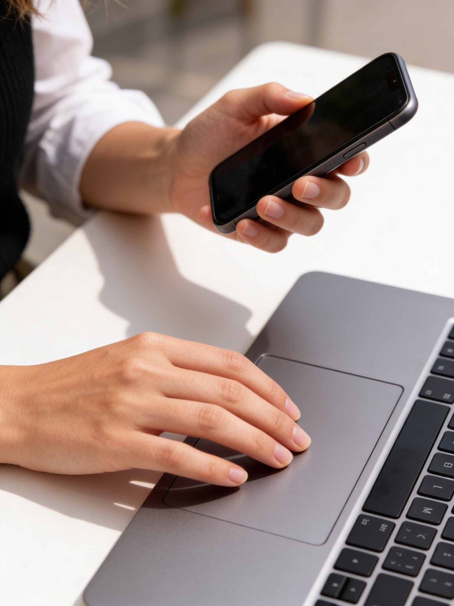 Close-up of hands using a smartphone and laptop, showcasing multitasking and modern technology in a bright, natural setting.