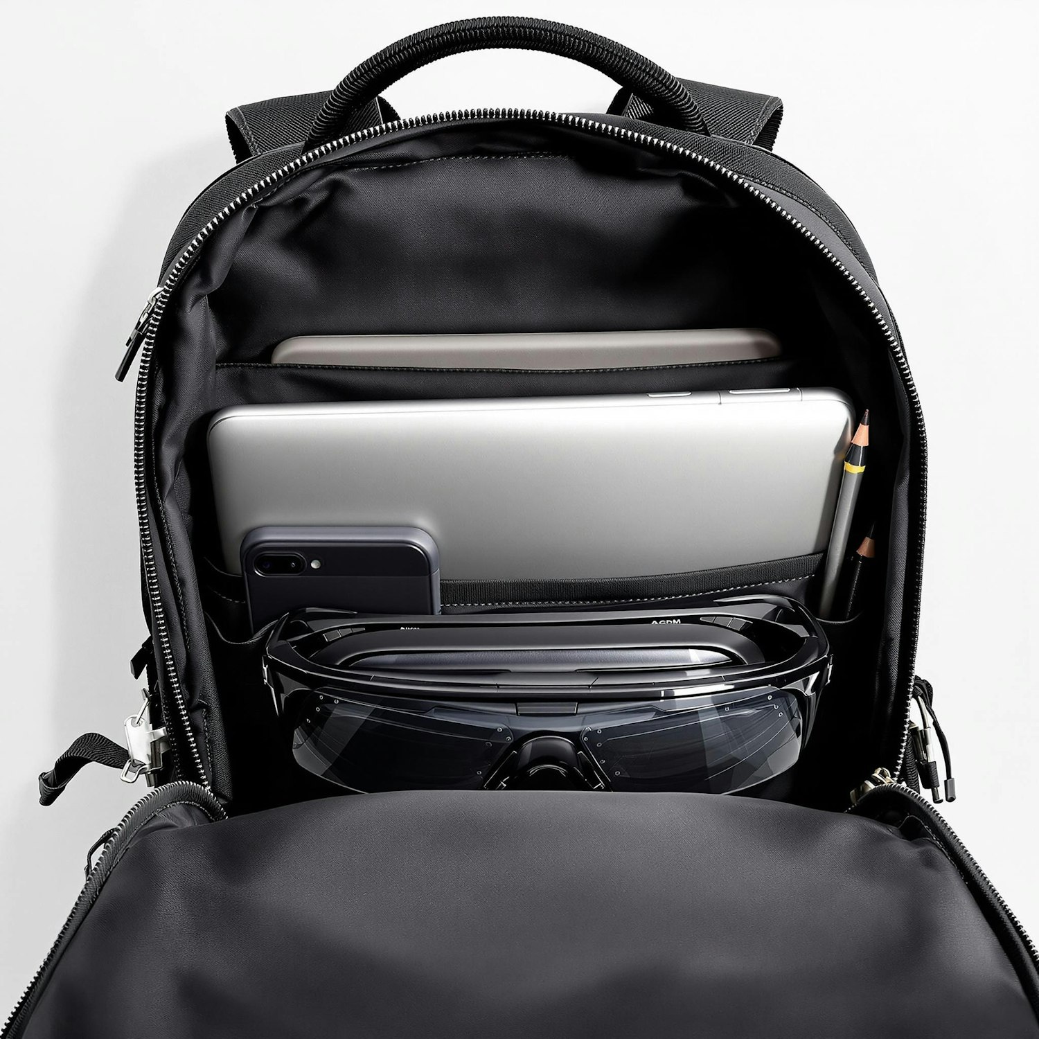 A black backpack with a laptop, AR glasses, smartphone, and pencils neatly organized in its compartments, perfect for tech enthusiasts.