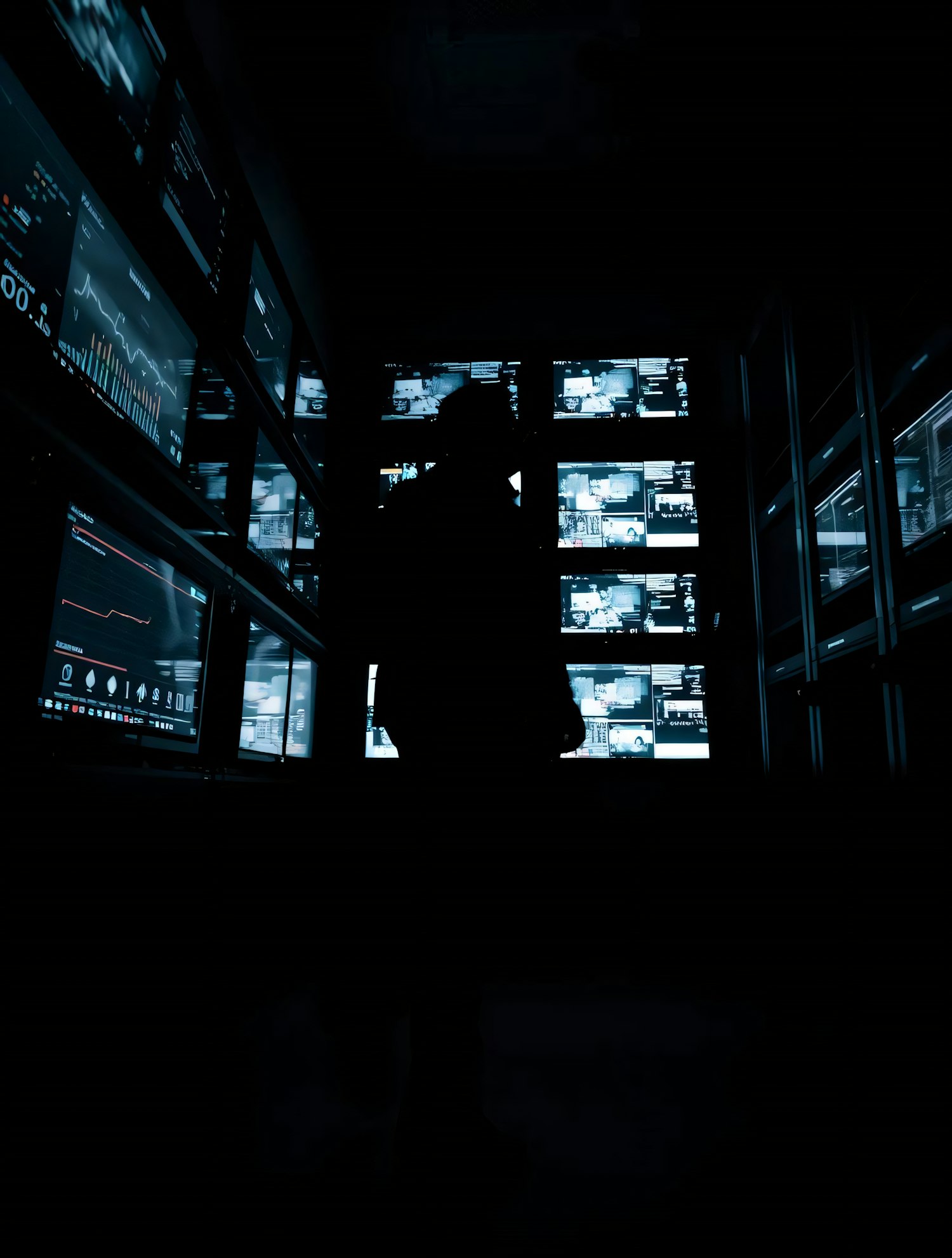 A dark room with glowing monitors and a silhouetted figure, creating a mysterious and tech-focused atmosphere.