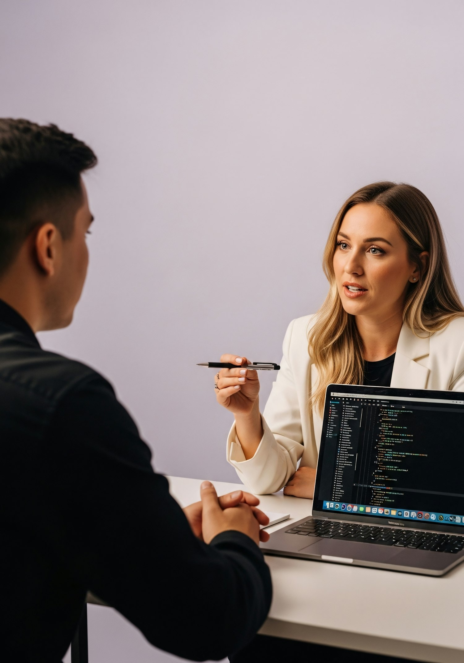Two professionals discussing code in a modern setting, with a laptop displaying programming scripts on a table.