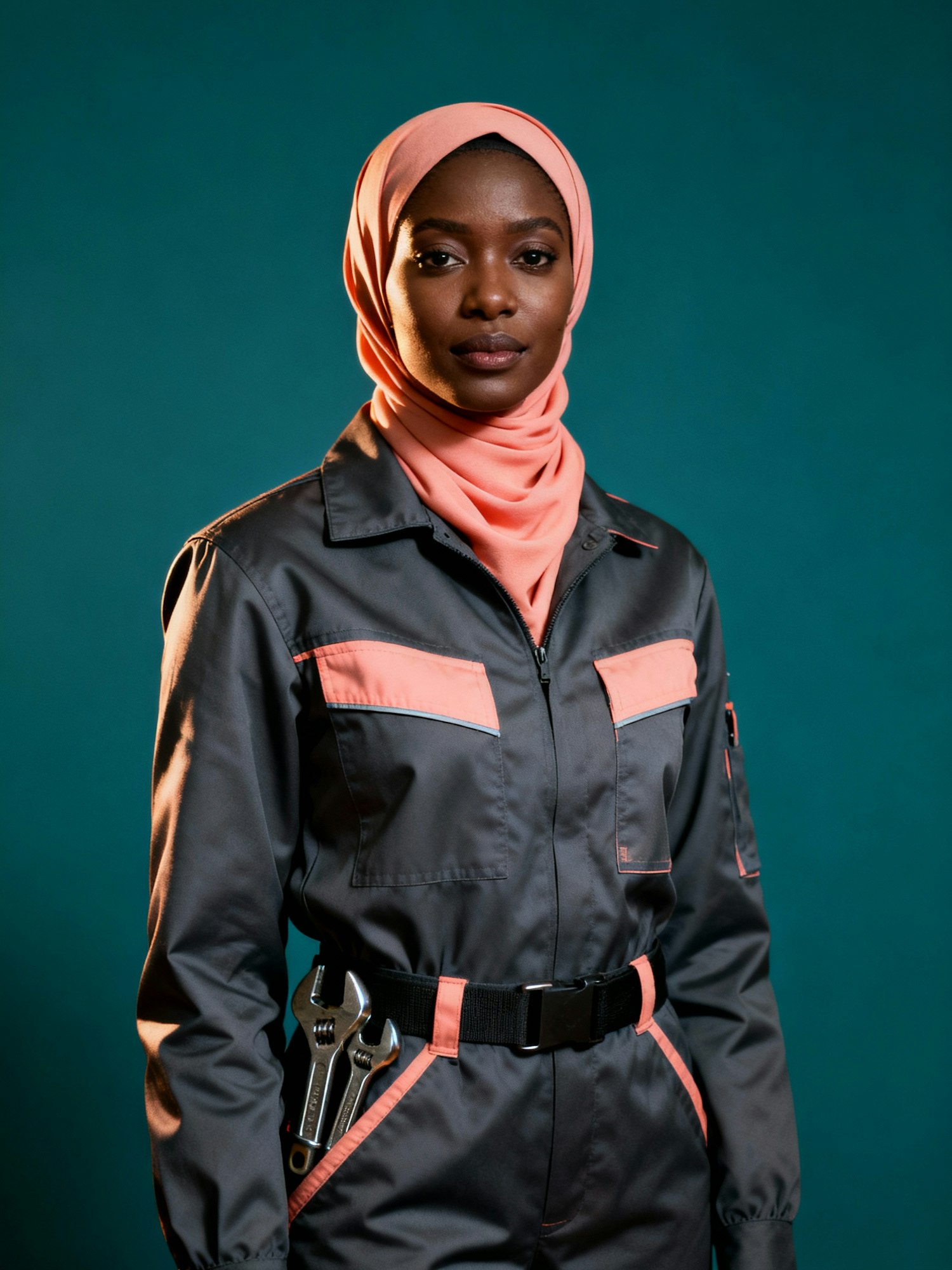 Cinematic portrait of a stylish Black female engineer wearing a sleek, deep-grey utility jumpsuit with soft coral detailing. She pairs it with a neatly wrapped, elegant hijab in a matching muted coral tone that complements her skin beautifully. She stands confidently against a smooth, matte teal background that enhances the outfit’s colours. Soft directional lighting highlights the structured seams, metallic engineering tools clipped at her belt, and the subtle sheen of the fabric. A gentle rim light gives her silhouette a polished, editorial feel. Her expression is calm, focused, and assured... blending professionalism with high-fashion energy.