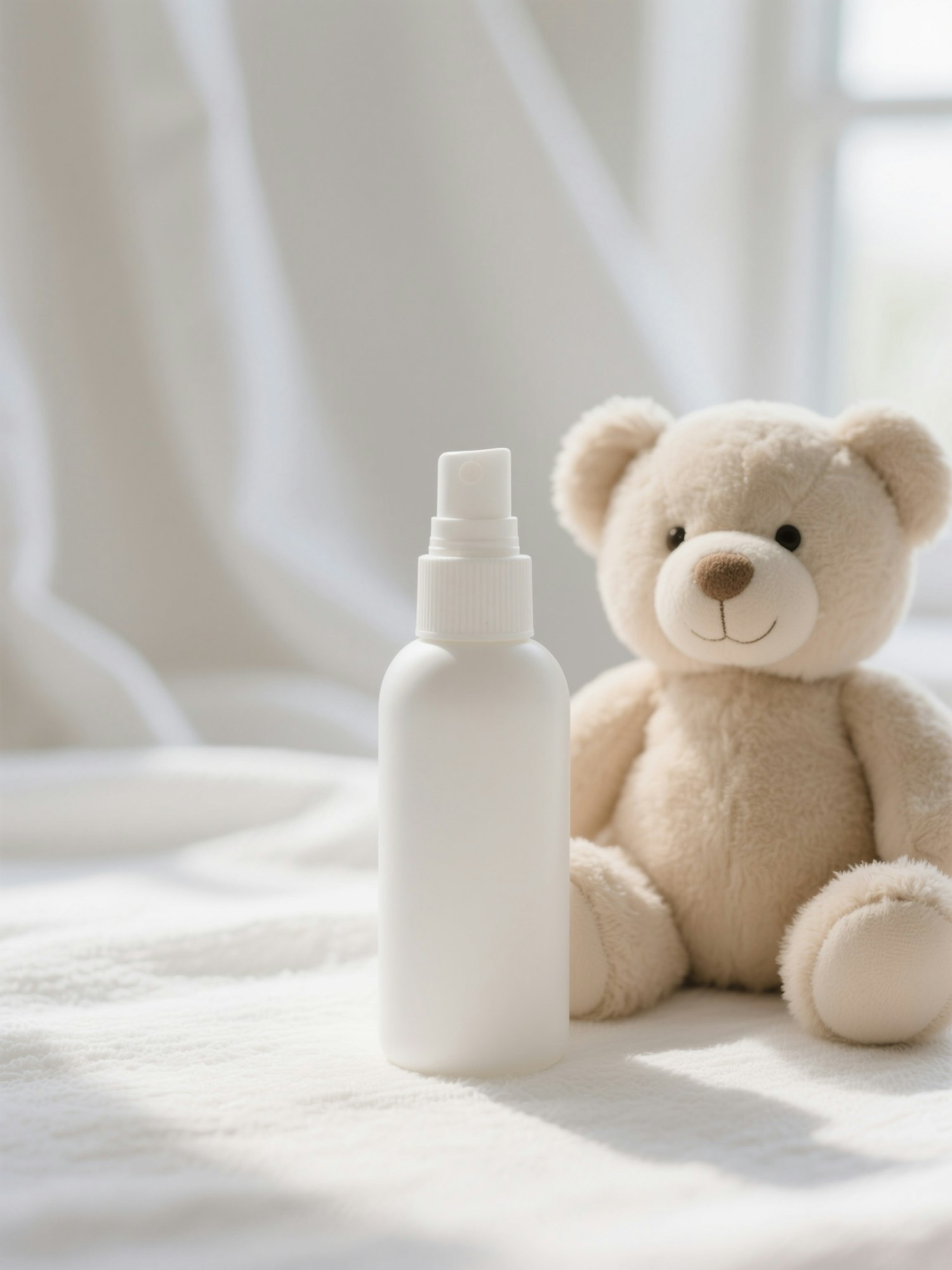 A cozy beige teddy bear sits beside a white spray bottle on a soft white surface, bathed in gentle natural light.