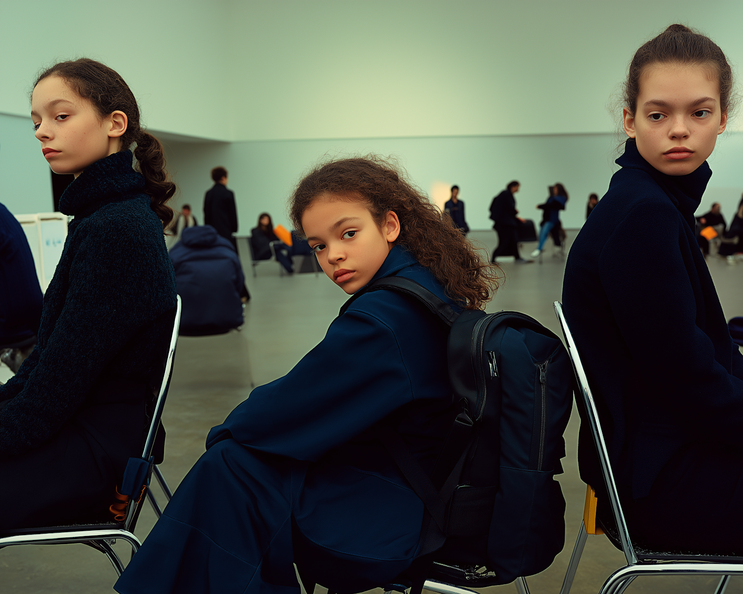 Three stylish teens in dark outfits sit in a modern indoor space, with one looking directly at the camera. Minimalist and moody vibe.