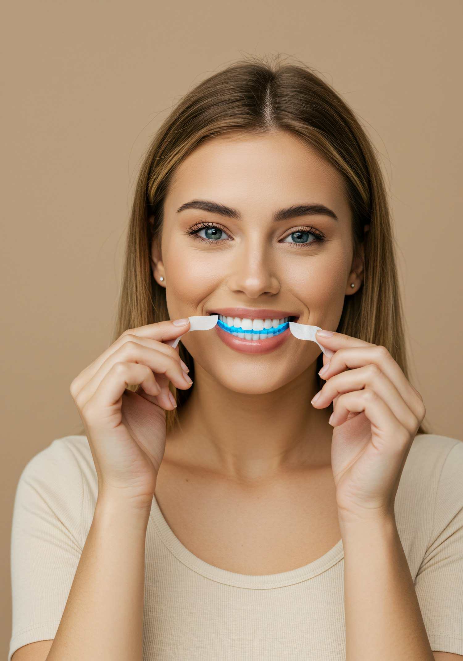 A young woman with light brown hair and blue eyes smiles while using glowing blue teeth whitening strips, set against a beige background.