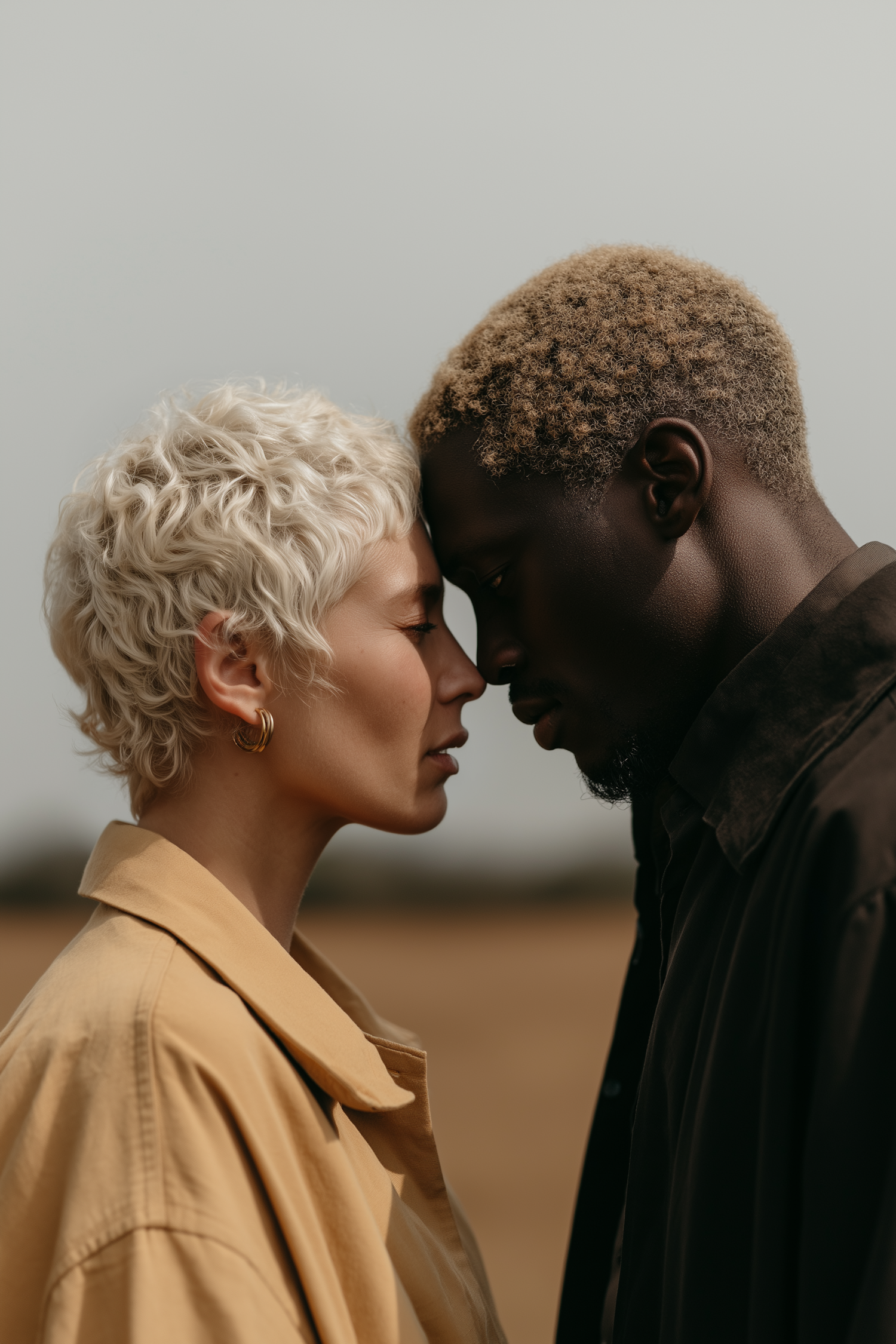 A close-up of two individuals sharing an intimate moment, their foreheads touching, with soft natural lighting and a blurred background.