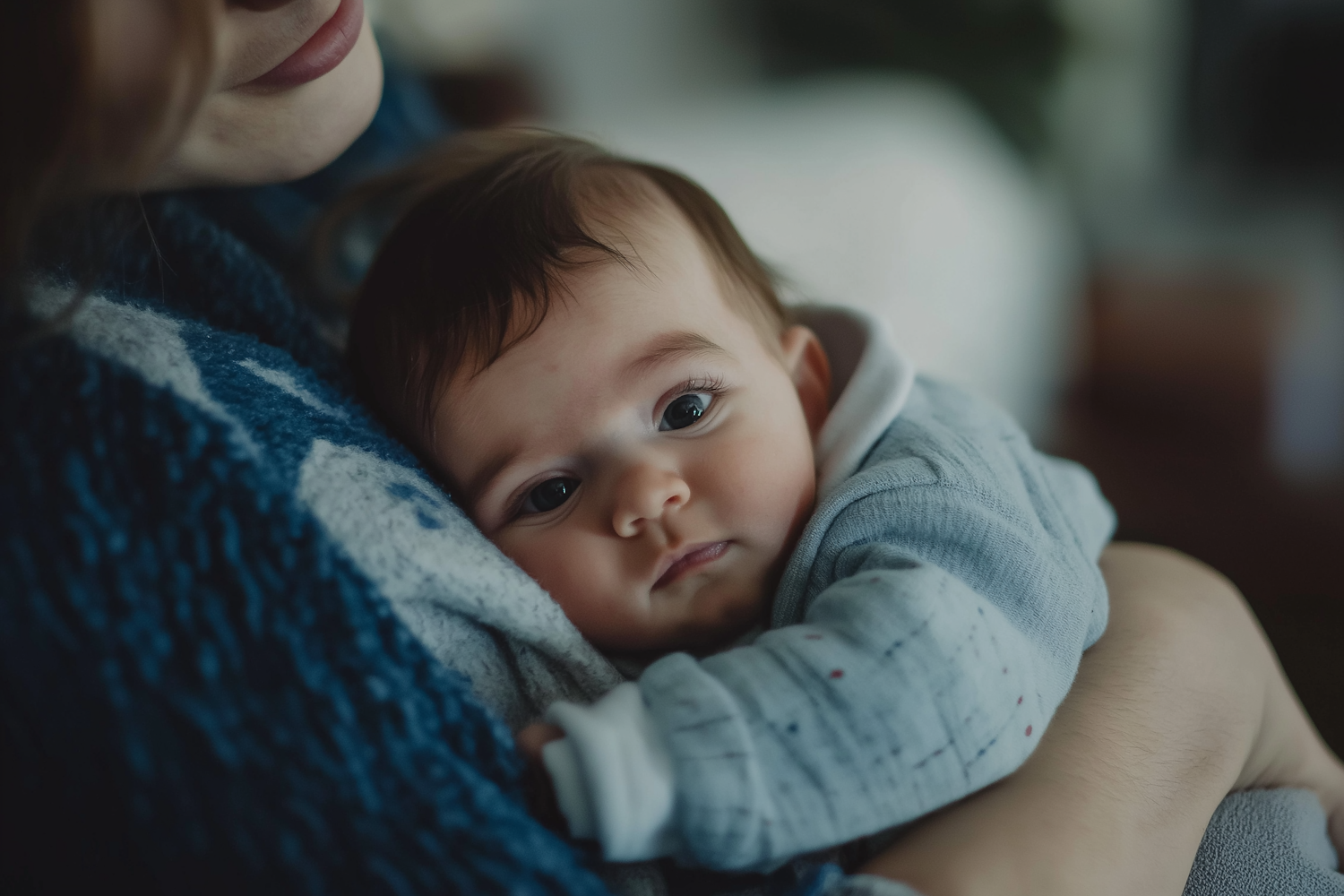 A baby with dark hair and large eyes rests peacefully in a caregiver's arms, wearing a light blue outfit. Warm and tender moment captured.