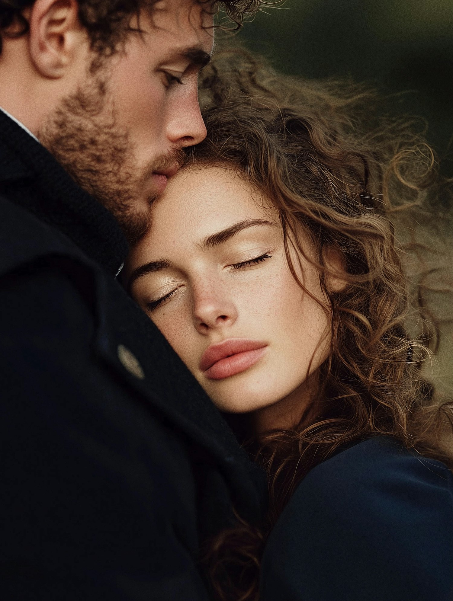 Tender close-up of a couple sharing an intimate moment, with soft lighting and a blurred background enhancing the emotional connection.