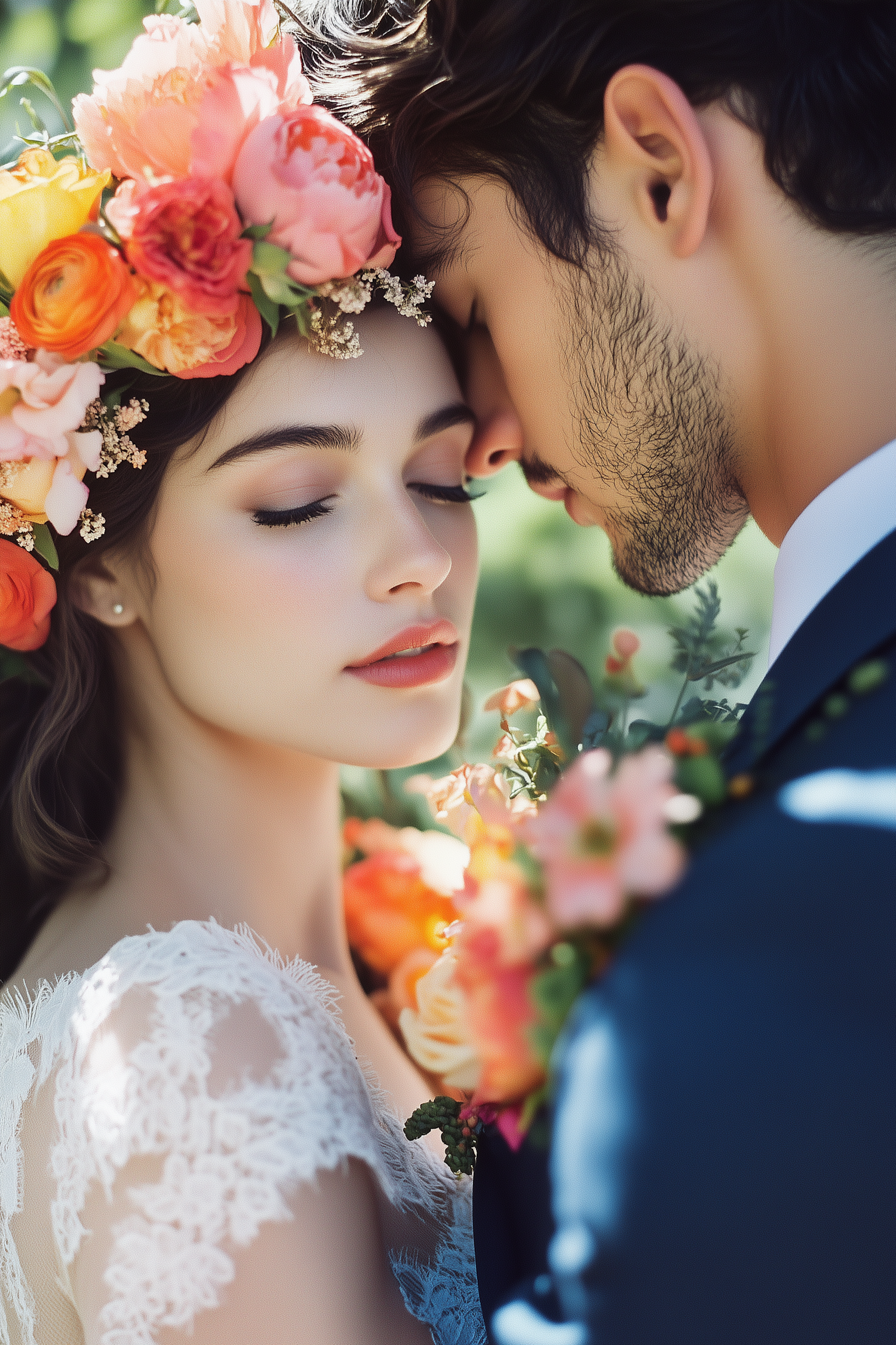 A romantic couple shares an intimate moment with floral accents, highlighting love and tenderness in a serene setting.